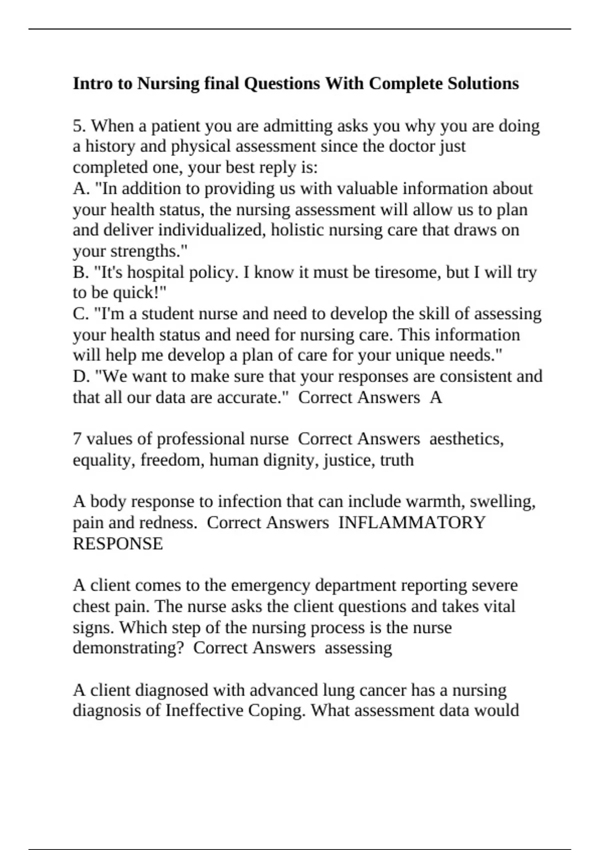 Intro to Nursing final Questions With Complete Solutions