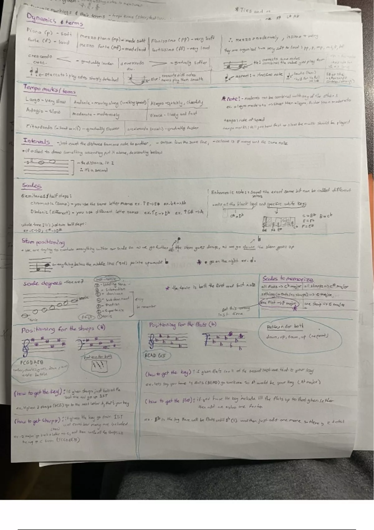 - dynamics and terms - tempo marks and terms - intervals -scales -stem positioning - scale degrees -scales to memorize - positioning for sharps and flats -qualities -and the piano