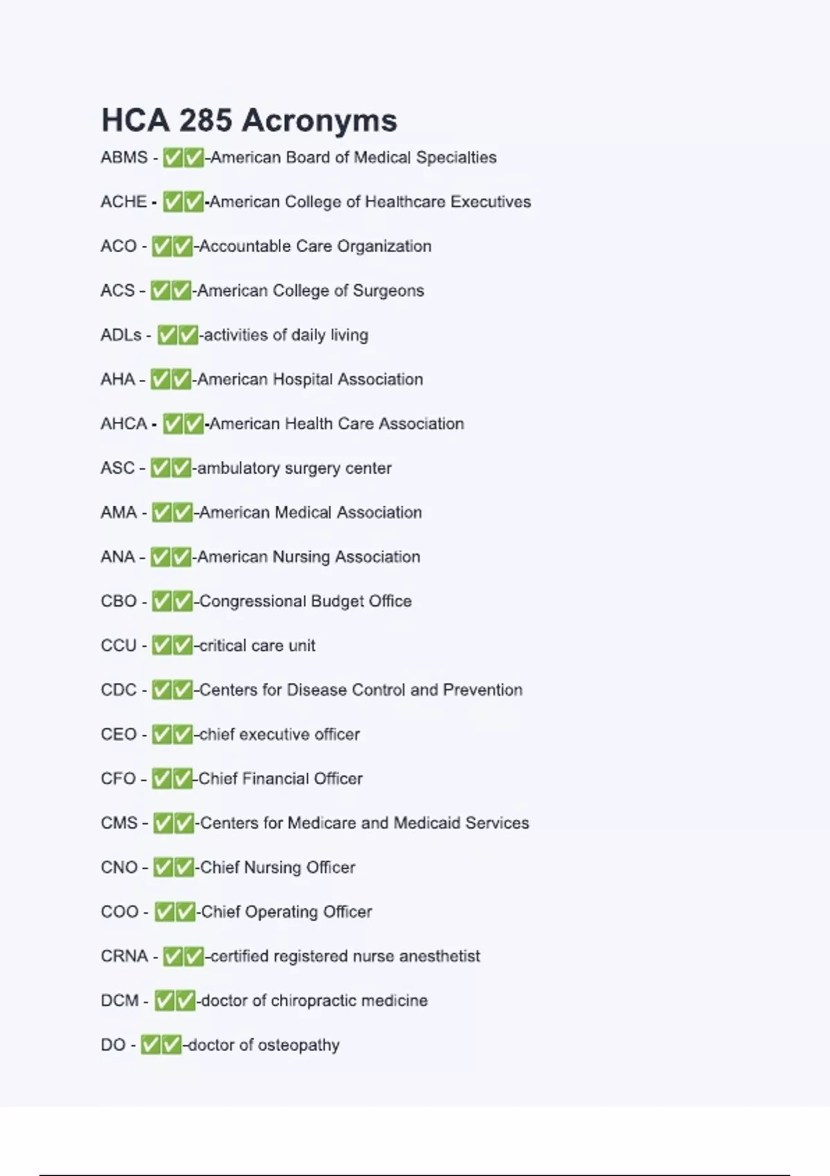 HCA 285 Acronyms with verified correct answers - complete solution 2024