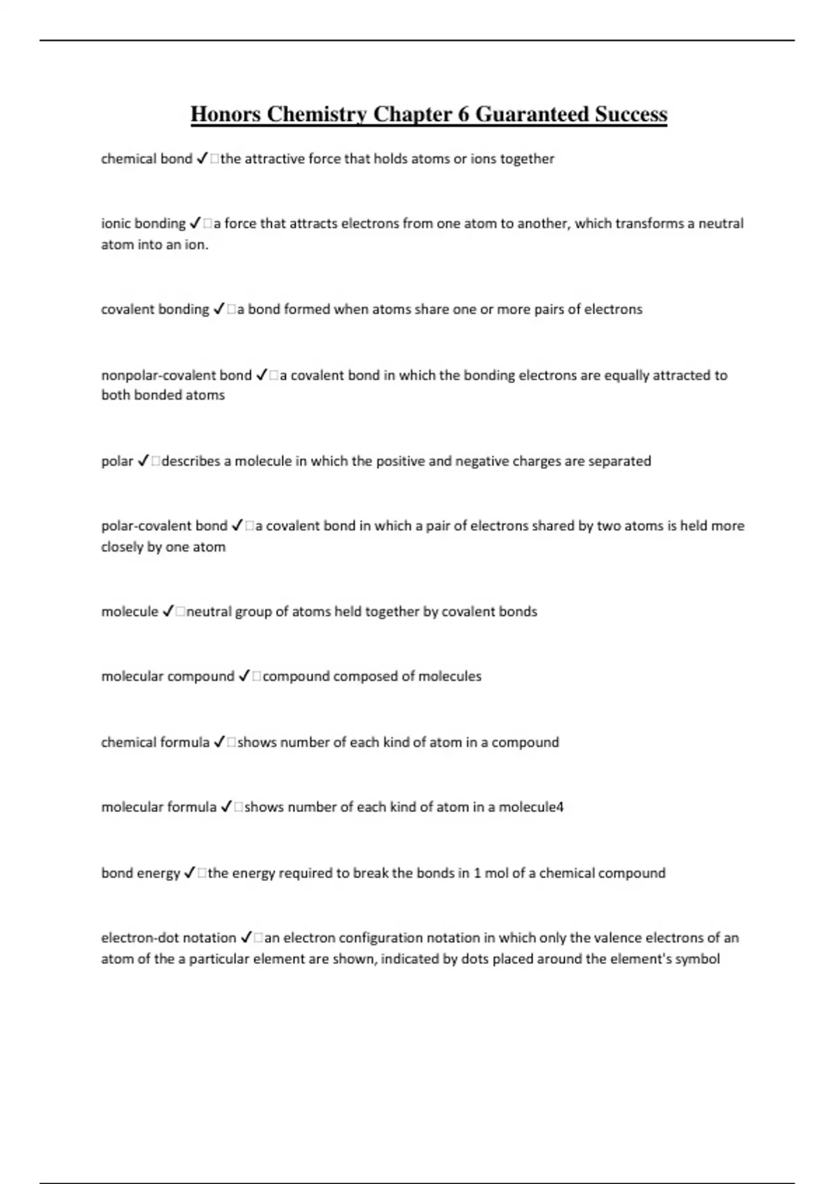 Honors Chemistry Chapter 6 Guaranteed Success chemical bond ️the attractive force that holds atoms or ions together ionic bonding ️a force that attracts electrons from one atom to another, which transforms a neutral atom into an ion. covalent bonding ️a bond formed when atoms share one or more pairs of electrons nonpolar-covalent bond ️a covalent bond in which the bonding electrons are equally attracted to both bonded atoms polar ️describes a molecule in which the positive and negative charges are separated polar-covalent bond ️a covalent bond in which a pair of electrons shared by two atoms is held more closely by one atom molecule ️neutral group of atoms held together by covalent bonds molecular compound ️compound composed of molecules chemical formula ️shows number of each kind of atom in a compound molecular formula ️shows number of each kind of atom in a molecule4 bond energy ️the energy required to break the bonds in 1 mol of a chemical compound electron-dot notation ️an electron configuration notation in which only the valence electrons of an atom of the a particular element are shown, indicated by dots placed around the element's symbol Lewis structure ️a structural formula in which electrons are represented by dots; dot pairs or dashes between two atomic symbols represent pairs in covalent bonds structural formula ️a formula that indicates the location of the atoms, groups, or ions relative to one another in a molecule and that indicates the number and location of chemical bonds. single bond ️a covalent bond in which two atoms share one pair of electrons multiple bond ️a bond in which the atoms share more than one pair of electrons, such as a double bond or a triple bond. resonance ️the bonding in molecules or ions that cannot be correctly represented by a single Lewis structure ionic compound ️a compound composed of ions bound together by electrostatic attraction formula unit ️the collection of atoms corresponding to an ionic compound's formula such that the molar mass of the compound is the same as the mass of 1 mol of formula units lattice energy ️the energy associated with constructing a crystal lattice relative to the energy of all constituent atoms separated by infinite distances polyatomic ion ️an ion made of two or more atoms. metallic bonding ️a bond formed by the attraction between positively charged metal ions and the electrons around them malleability ️the ability of a substance to be hammered or beaten into a sheet. ductility ️the ability of a substance to be hammered thin or drawn out into a wire. diatomic molecule ️molecule containing only 2 atoms bond energy ️the energy required to break a chemical bond and form neutral, isolated atoms bond length is determined by... ️the position of lowest PE VSEPR theory ️... hybridization ️... dipole ️... London dispersion forces ️... Hybrid orbitals ️... Hydrogen bonding ️...