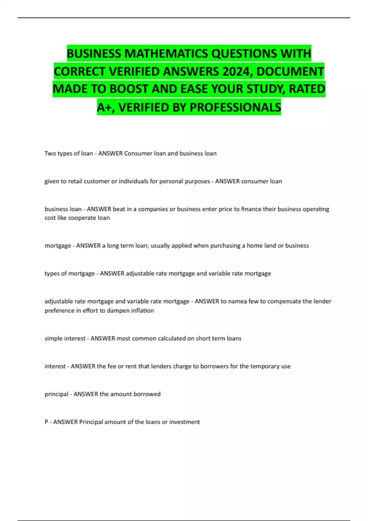 BUSINESS MATHEMATICS QUESTIONS WITH CORRECT VERIFIED ANSWERS 2024, DOCUMENT MADE TO BOOST AND EASE YOUR STUDY, RATED A+, VERIFIED BY PROFESSIONALS