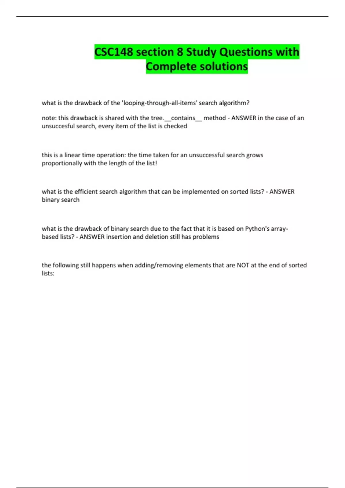 CSC148 section 8 Study Questions with Complete solutions