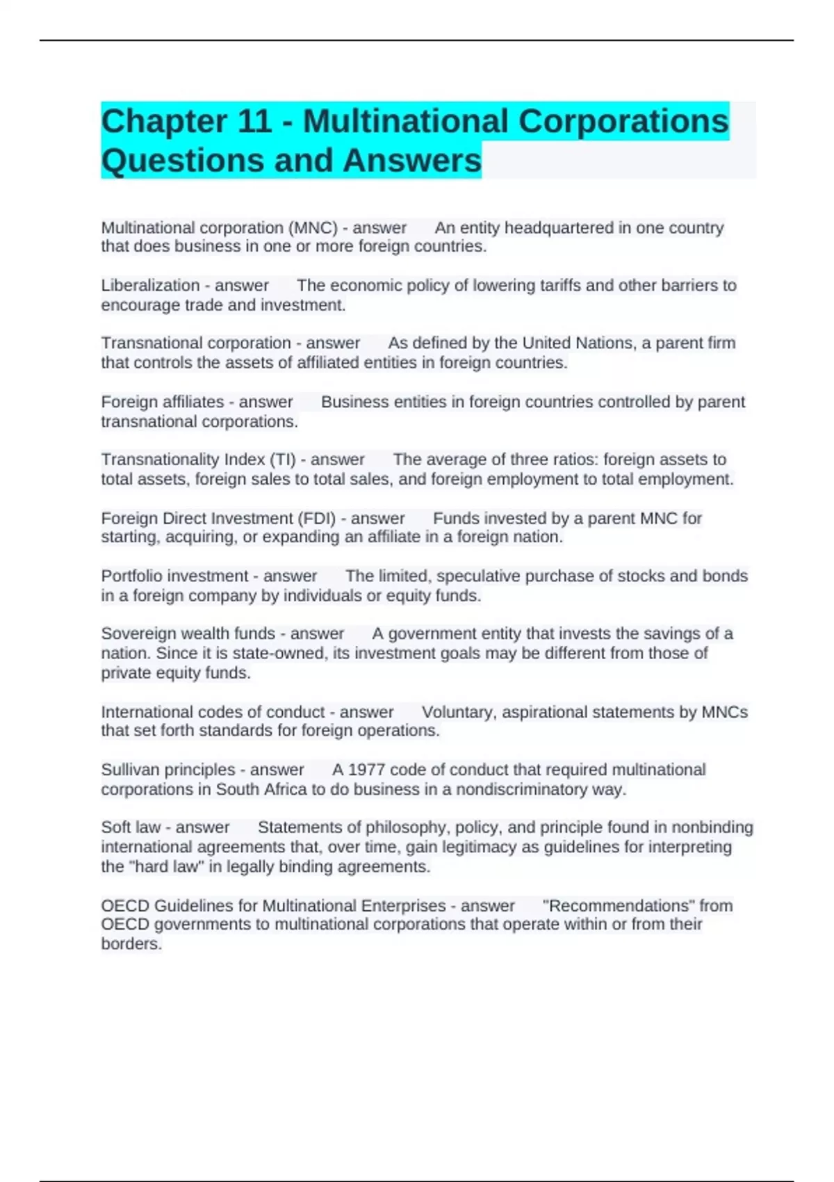 Chapter 11 - Multinational Corporations Questions and Answers Multinational corporation (MNC) An entity headquartered in one country that does business in one or more foreign countries. Liberalization The economic policy of lowering tariffs and other barriers to encourage trade and investment. Previous Play Next Rewind 10 seconds Move forward 10 seconds Unmute 0:00 / 0:15 Full screen Brainpower Read More Transnational corporation As defined by the United Nations, a parent firm that controls the assets of affiliated entities in foreign countries. Foreign affiliates Business entities in foreign countries controlled by parent transnational corporations. Transnationality Index (TI) The average of three ratios: foreign assets to total assets, foreign sales to total sales, and foreign employment to total employment. Foreign Direct Investment (FDI) Funds invested by a parent MNC for starting, acquiring, or expanding an affiliate in a foreign nation. Portfolio investment The limited, speculative purchase of stocks and bonds in a foreign company by individuals or equity funds. Sovereign wealth funds A government entity that invests the savings of a nation. Since it is state-owned, its investment goals may be different from those of private equity funds. International codes of conduct Voluntary, aspirational statements by MNCs that set forth standards for foreign operations. Sullivan principles A 1977 code of conduct that required multinational corporations in South Africa to do business in a nondiscriminatory way. Soft law Statements of philosophy, policy, and principle found in nonbinding international agreements that, over time, gain legitimacy as guidelines for interpreting the "hard law" in legally binding agreements. OECD Guidelines for Multinational Enterprises "Recommendations" from OECD governments to multinational corporations that operate within or from their borders. National contact point Offices set by governments that join in the guidelines ("encourage" observance of the Guidelines) Convention on Biological Diversity A treaty that requires nations to preserve biological diversity by promoting sustainable economic activity. It emerged from the UN-sponsored Earth Summit in 1992 and has been signed by 163 nations. Rio Declaration A set of 27 principles for sustainable development that emerged from the 1992 Earth Summit, a UN Conference of 172 nations and 2,400 NGOs held in Rio de Janeiro. Communication on progress The required annual report of a company participating in the Global Compact. It explains how the company is implementing the 10 principles. Bluewashing The act of a corporation cloaking its lack of social responsibility by insincere membership in the UN Global Compact.