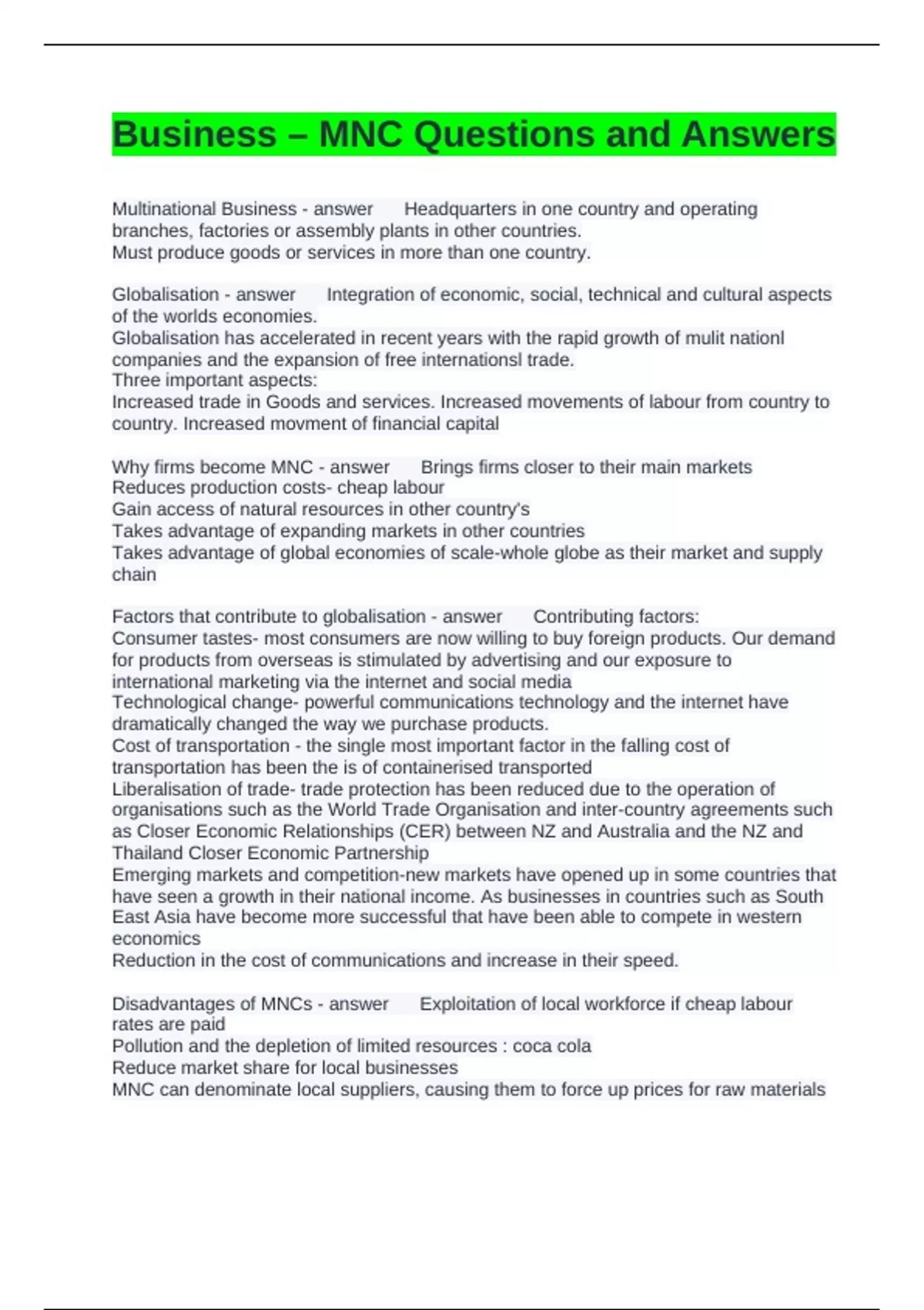 Disadvantages of MNCs - answer Exploitation of local workforce if cheap labour
