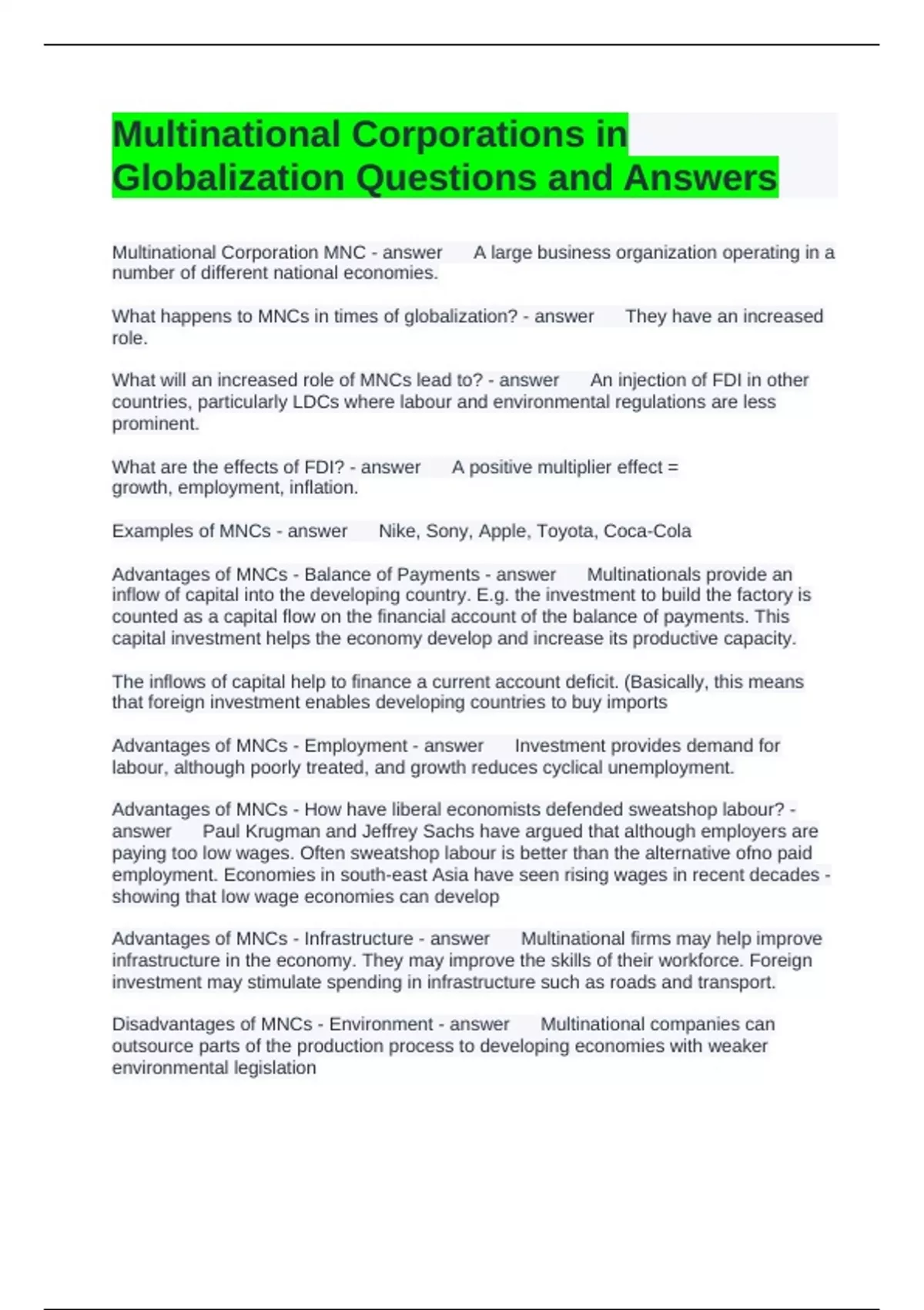 Multinational Corporations in Globalization Questions and Answers Multinational Corporation MNC A large business organization operating in a number of different national economies. What happens to MNCs in times of globalization? They have an increased role. Previous Play Next Rewind 10 seconds Move forward 10 seconds Unmute 0:00 / 0:15 Full screen Brainpower Read More What will an increased role of MNCs lead to? An injection of FDI in other countries, particularly LDCs where labour and environmental regulations are less prominent. What are the effects of FDI? A positive multiplier effect = growth, employment, inflation. Examples of MNCs Nike, Sony, Apple, Toyota, Coca-Cola Advantages of MNCs - Balance of Payments Multinationals provide an inflow of capital into the developing country. E.g. the investment to build the factory is counted as a capital flow on the financial account of the balance of payments. This capital investment helps the economy develop and increase its productive capacity. The inflows of capital help to finance a current account deficit. (Basically, this means that foreign investment enables developing countries to buy imports Advantages of MNCs - Employment Investment provides demand for labour, although poorly treated, and growth reduces cyclical unemployment. Advantages of MNCs - How have liberal economists defended sweatshop labour? Paul Krugman and Jeffrey Sachs have argued that although employers are paying too low wages. Often sweatshop labour is better than the alternative ofno paid employment. Economies in south-east Asia have seen rising wages in recent decades - showing that low wage economies can develop Advantages of MNCs - Infrastructure Multinational firms may help improve infrastructure in the economy. They may improve the skills of their workforce. Foreign investment may stimulate spending in infrastructure such as roads and transport. Disadvantages of MNCs - Environment Multinational companies can outsource parts of the production process to developing economies with weaker environmental legislation Disadvantages of MNCs - Regulatory capture MNCs can begin to dominate a country and use their financial clout in LDCs to influence policy which benefits them at the expense of the nation. Disadvantages of MNCs - Profit Although multinationals invest in developing economies, the profit is repatriated to the location of the multinational, so the net capital inflows are less than they seem. Disadvantages of MNCs - top jobs When undertaking new projects, the multinational may have to employ skilled labour from other economies and not the developing economy. This means best jobs are not received by local workers and the investment is diffused. Diagrams for MNCs AD out. LRAS out. Disadvantages of MNCs - Poor workers Not all economists are convinced sweat-shop labour is a good thing. Critics argue that weak labour conditions allow multinationals to use their monopsony power and pay lower wages to workers than they should get paid. Inflation High demand pull, low inflation in the long run, agflation, falling cost push inflation due to cheaper outsourcing of raw materials and a fall in corporation tax to attract MNCs.