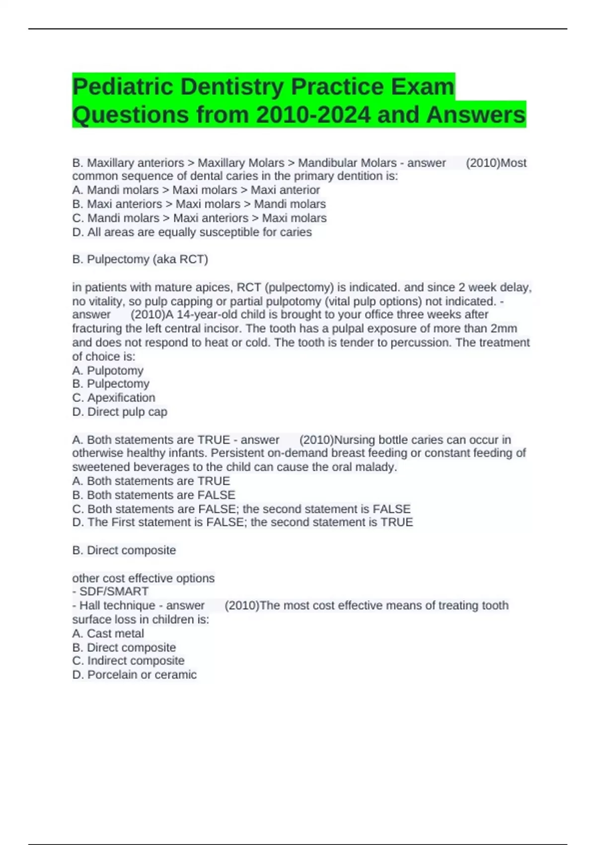 Pediatric Dentistry Practice Exam Questions from and Answers