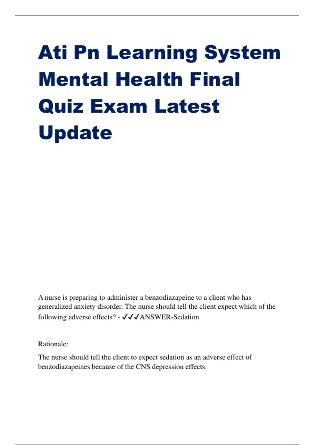 Ati Pn Learning System Mental Health Final Quiz Exam Latest Update A nurse is preparing to administer a benzodiazapeine to a client who has generalized anxiety disorder. The nurse should tell the client expect which of the following adverse effects? - ANSWER-Sedation Rationale: The nurse should tell the client to expect sedation as an adverse effect of benzodiazapeines because of the CNS depression effects.