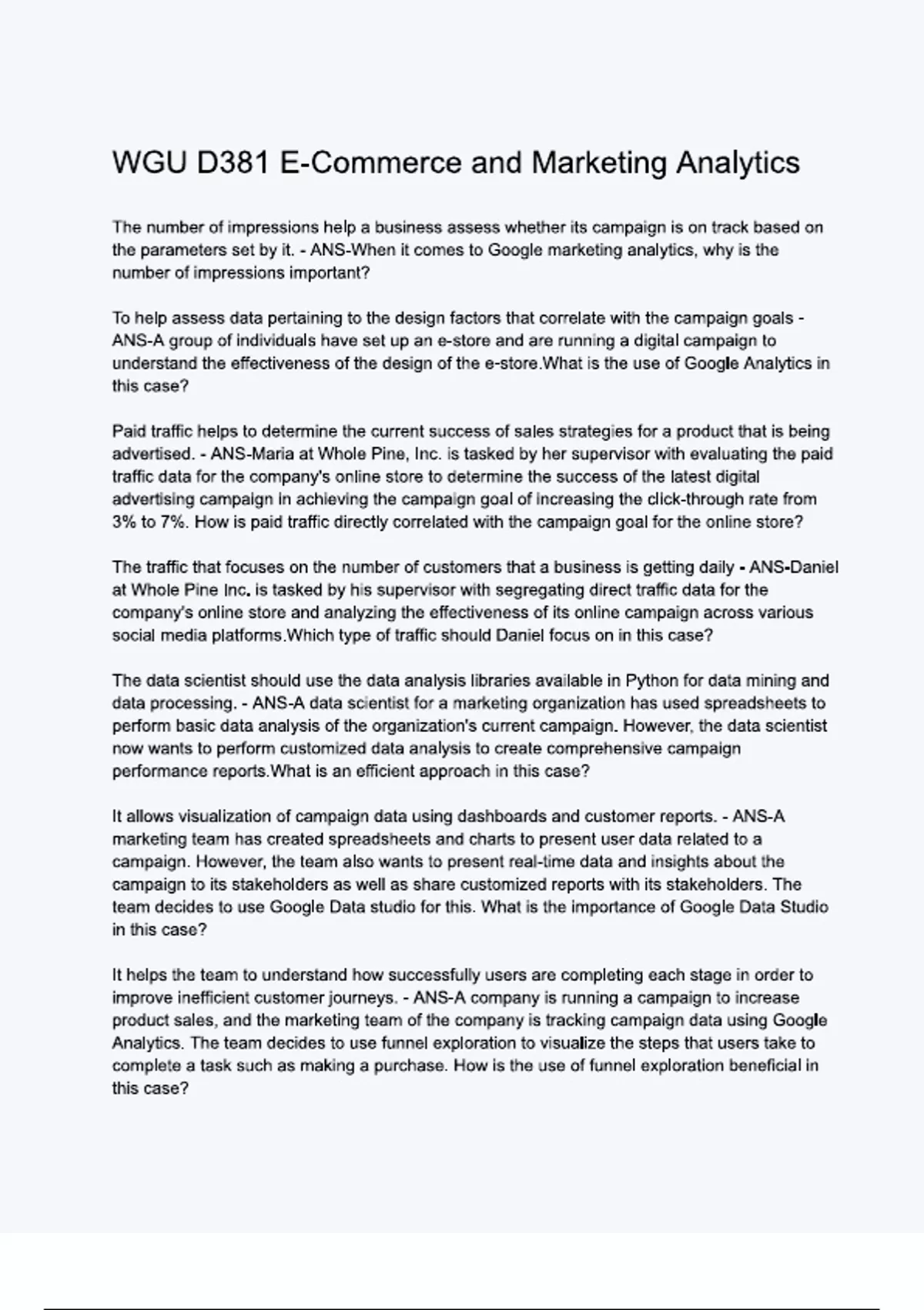 WGU D381 E-Commerce and Marketing Analytics Questions & 100% Verified Correct Answers with complete solutions (Latest update
