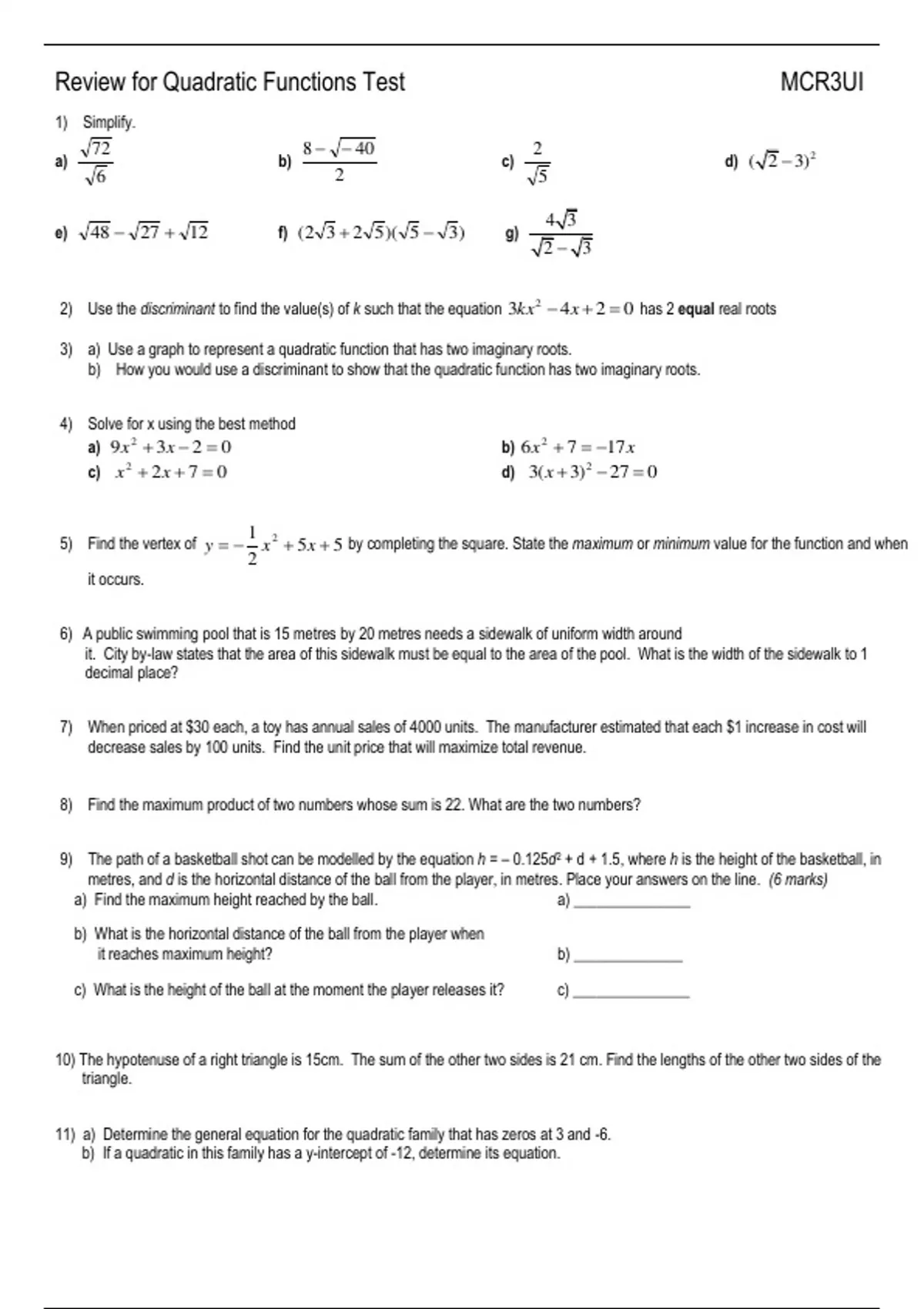 Review for Quadratic Functions Test MCR3UI