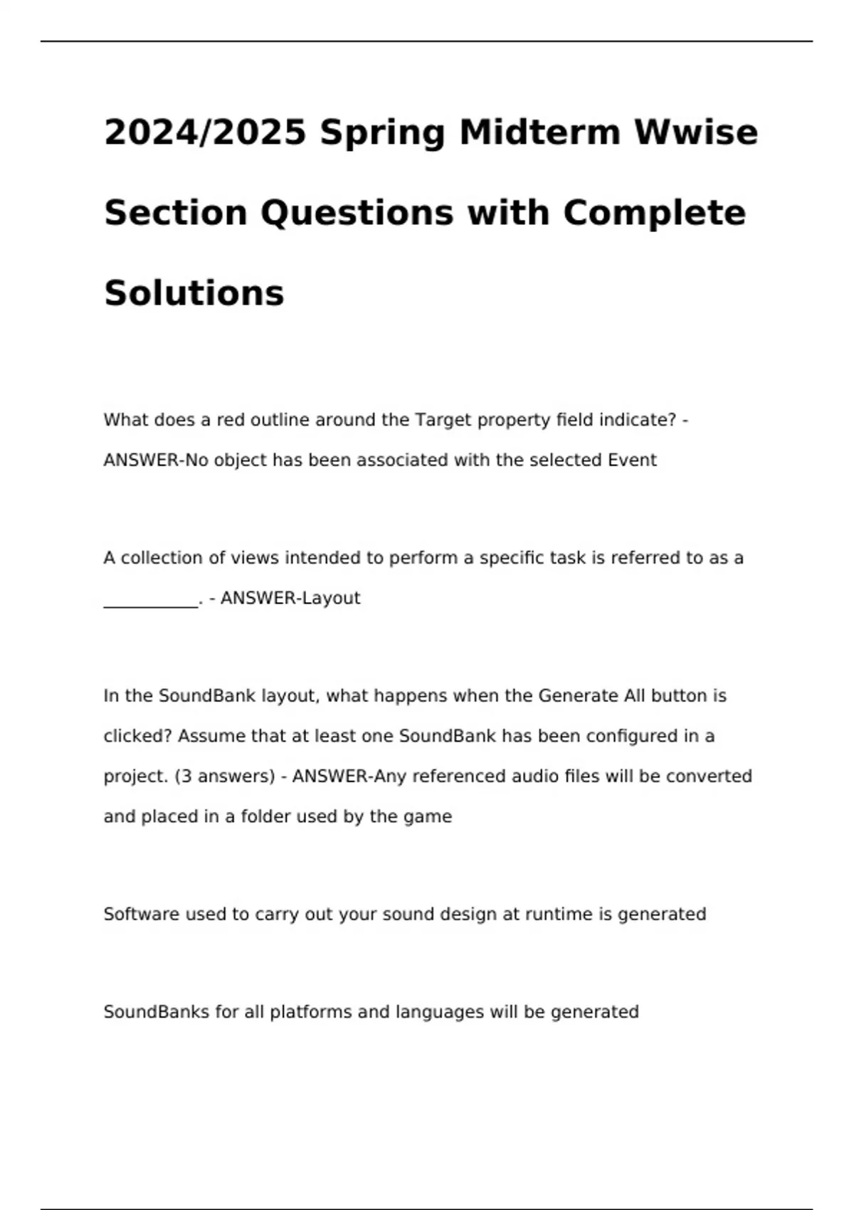 2024/2025 Spring Midterm Wwise Section Questions with Complete Solutions2024/2025 Spring Midterm Wwise Section Questions with Complete Solutions2024/2025 Spring Midterm Wwise Section Questions with Complete Solutions2024/2025 Spring Midterm Wwise Section Questions with Complete Solutions What does a red outline around the Target property field indicate? - ANSWER-No object has been associated with the selected Event A collection of views intended to perform a specific task is referred to as a ___________. - ANSWER-Layout In the SoundBank layout, what happens when the Generate All button is clicked?