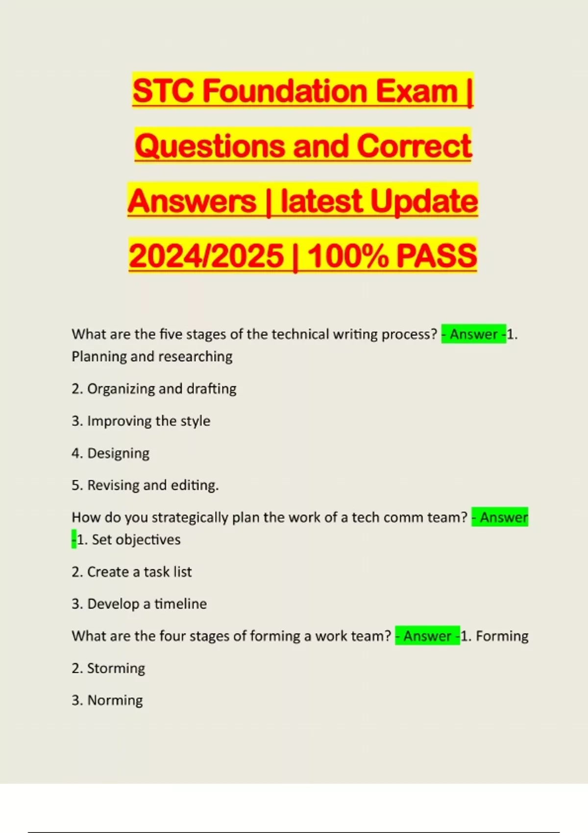STC Foundation Exam | Questions and Correct Answers | latest Update 2024/2025 | 100% PASS What are the five stages of the technical writing process? - Answer -1. Planning and researching 2. Organizing and drafting 3. Improving the style 4. Designing 5. Revising and editing. How do you strategically plan the work of a tech comm team? - Answer -1. Set objectives 2. Create a task list 3. Develop a timeline What are the four stages of forming a work team? - Answer -1. Forming 2. Storming 3. Norming4. Performing What are the different types of websites used in the workplace? - Answer -1. Social networks 2. Wiki