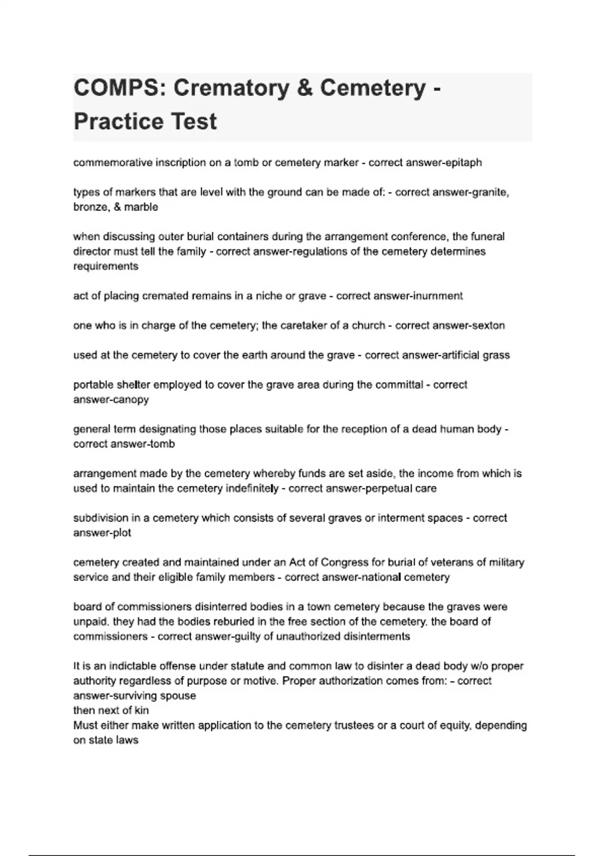 comps crematory cemetery practice test