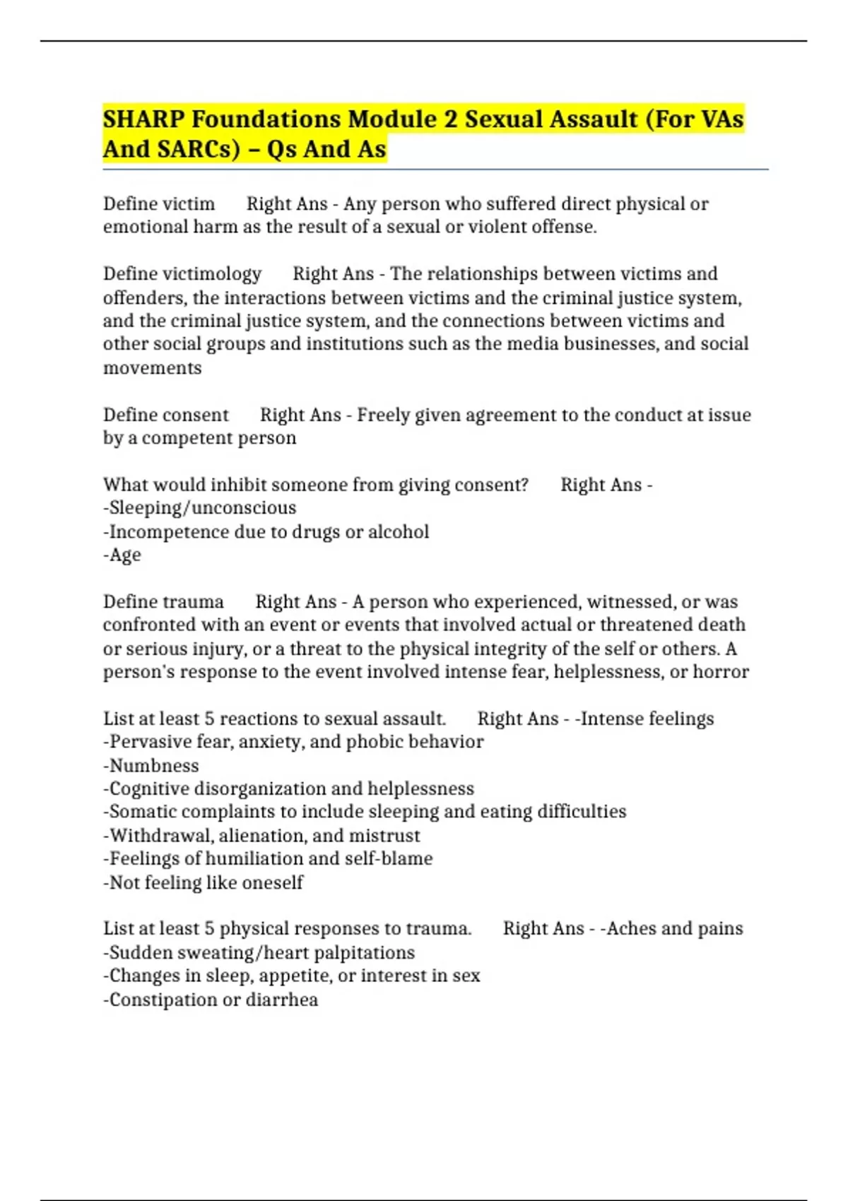 List at least 5 physical responses to trauma. Right Ans - -Aches and pains