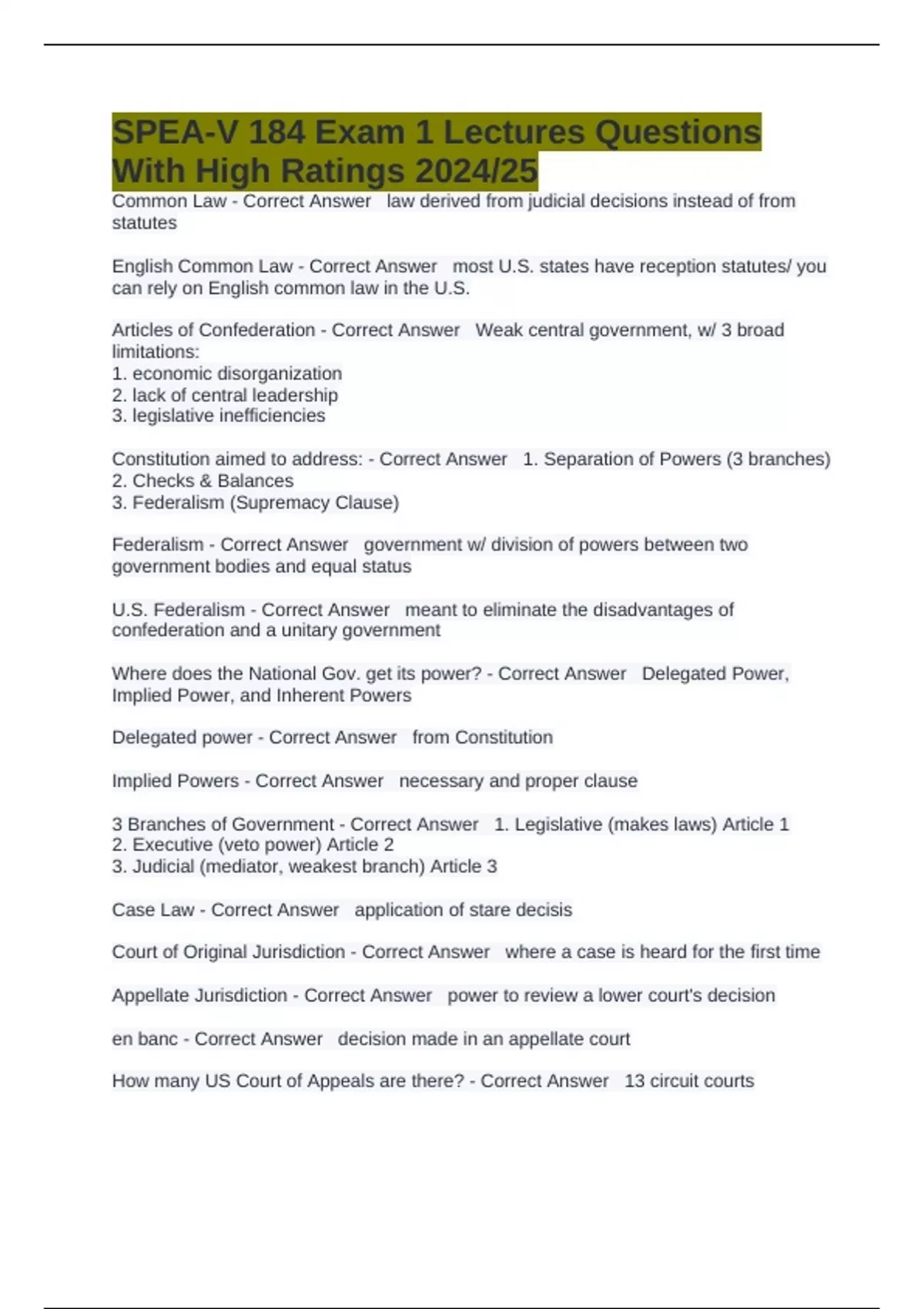 Supremacy Clause - Correct Answer U.S. Constitution is the supreme law of the land