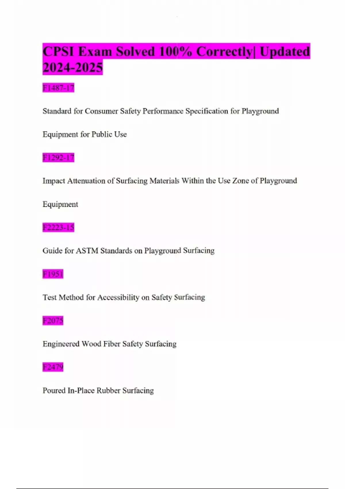 CPSI Exam Solved 100% Correctly| Updated F1487-17 Standard for Consumer Safety Performance Specification for Playground Equipment for Public Use F1292-17 Impact Attenuation of Surfacing Materials Within the Use Zone of Playground Equipment F2223-15 Guide for ASTM Standards on Playground Surfacing F1951 Test Method for Accessibility on Safety Surfacing F2075 Engineered Wood Fiber Safety Surfacing F2479 Poured In-Place Rubber Surfacing F3012 Loose-Fill Rubber Surfacing G-MAX Maximum acceleration of a head during impact G-MAX Threshold G-MAX 200 HIC HEAD INJURY CRITERIA - MEASURE OF IMPACT SEVERITY THAT COMBINES TIME/ ENERGY OF IMPACT