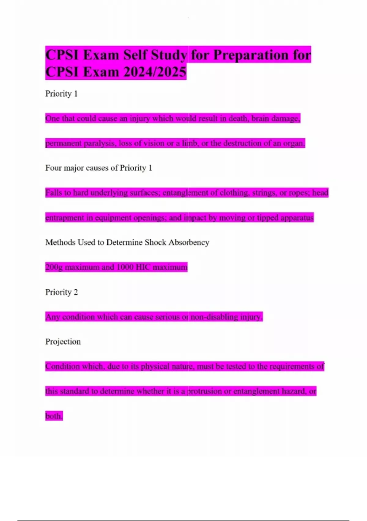 CPSI Exam Self Study for Preparation for CPSI Exam 2024/2025 Priority 1 One that could cause an injury which would result in death, brain damage, permanent paralysis, loss of vision or a limb, or the destruction of an organ. Four major causes of Priority 1 Falls to hard underlying surfaces; entanglement of clothing, strings, or ropes; head entrapment in equipment openings; and impact by moving or tipped apparatus Methods Used to Determine Shock Absorbency 200g maximum and 1000 HIC maximum Priority 2 Any condition which can cause serious or non-disabling injury. Projection Condition which, due to its physical nature, must be tested to the requirements of this standard to determine whether it is a protrusion or entanglement hazard, or both. Entanglement Condition in which the user's clothes or something around the user's neck becomes caught or entwined on a component of playground equipment; Examples include bolt ends that extend more than two threads beyond the face of the nut and open S type hooks. Entrapment Any condition which impedes withdrawal of a body or body part that has penetrated an opening; No opening may measure between three and one-half inches and nine inches Protective Barrier
