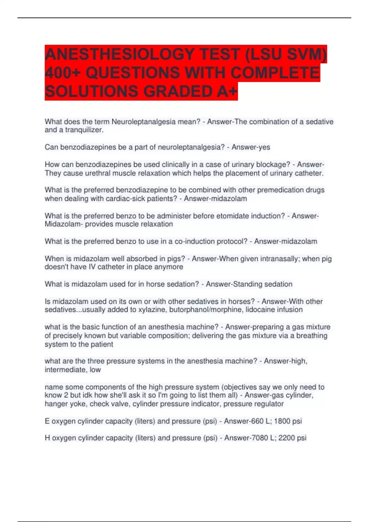 ANESTHESIOLOGY TEST (LSU SVM) 400+ QUESTIONS WITH COMPLETE SOLUTIONS GRADED A+