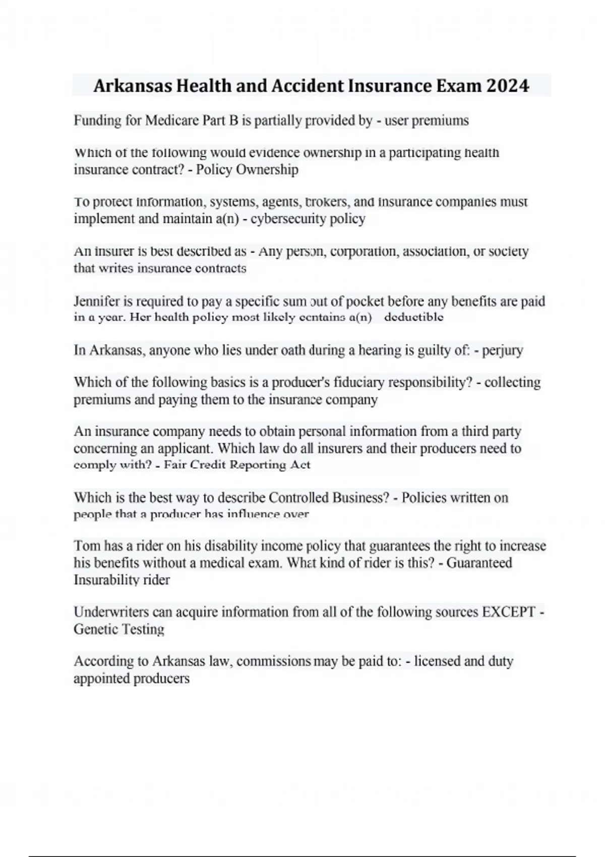 Funding for Medicare Part B is partially provided by - user premiums Which of the following would evidence ownership in a participating health insurance contract? - Policy Ownership To protect information, systems, agents, brokers, and insurance companies must implement and maintain a(n) - cybersecurity policy An insurer is best described as - Any person, corporation, association, or society that writes insurance contracts Jennifer is required to pay a specific sum out of pocket before any benefits are paid in a year. Her health policy most likely contains a(n) - deductible In Arkansas, anyone who lies under oath during a hearing is guilty of: - perjury Which of the following basics is a producer's fiduciary responsibility? - collecting premiums and paying them to the insurance company An insurance company needs to obtain personal information from a third party concerning an applicant. Which law do all insurers and their producers need to comply with? - Fair Credit Reporting Act Which is the best way to describe Controlled Business? - Policies written on people that a producer has influence over Tom has a rider on his disability income policy that guarantees the right to increase his benefits without a medical exam. What kind of rider is this? - Guaranteed Insurability rider Underwriters can acquire information from all of the following sources EXCEPT - Genetic Testing According to Arkansas law, commissions may be paid to: - licensed and duty appointed producers If a person is convicted of a crime stemming from a hearing, a fine up to $ per violation may be imposed - $1,000 The document that describes policy features, benefits, exclusions and riders in a Long-Term Care policy is known as the - Outline of Coverage Which of the following is NOT included under a health benefit plan? - Hospital indemnity plan Which of the following constitutes grounds for suspending an Arkansas producer's license? - Felony conviction Once a policy has been reinstated the insured must wait what amount of time before coverage for sickness is available? - 10 days Which of the following signatures is not required on an individual insurance application? - insurer Which of the following nursing home options would BEST suit an individual who needs some nursing care and supervision but NOT full-time care? - Assisted living facilities An employer is issued a group medical insurance policy. This single contract is known as a(n) - employer contract Under the Health Insurance Portability and Accountability Act (HIPAA), the employee's new Group Health Plan will verify Creditable Coverage so that the - employee's waiting period for coverage of a preexisting condition can be reduced under the new employer's health plan a nonparticipating policy will - not pay dividends Which of the following statements is TRUE about an insurer's right to screen applicants for HIV? - An insurer can require a blood test for HIV Any person who knowingly sells, solicits, or negotiates insurance products with a person or entity that is not licensed in Arkansas is guilty of - A class D felony Upon policy delivery, which of the following must a producer have an applicant sign if no initial premium was collected with the health insurance application? - a good health statement Kathy pays a monthly premium on her health insurance policy. How long is her grace period? - 10 days Richard owns an insurance policy that is renewable only at the option of the insurance company. His policy is considered to be - optionally renewable Which clause defines total disability as being unable to perform the major duties of the insured's regular occupation? - own occupation clause In contrast to a guaranteed renewable policy, a noncancellable policy - may never raise premiums Which of the following is NOT a common exclusion for a medical expense policy? - Physical therapy One of the most important considerations when replacing health insurance would be the - exclusions on a new policy a beneficiary change can occur - normally at any time during the policy term Which of the following is NOT considered advertising? - a rating from a rating service company, such as A.M. Best Small employers who are sponsored by an insurer to provide group benefits to its employees are called - MEWA Which of the following actions may an insurance company NOT do in a health policy that contains a guaranteed renewable premium benefit? - increase the premium on an individual basis The renewable period for a producer's license is a - two-year term Which of the following statements most aptly describe health insurance benefits? - the greater the benefits, the higher the premium Which of the following is NOT a reason for the commissioner to deny or refuse a producer license application? - Unintentionally misrepresented a material fact on the application An individual covered under a Blue Cross Blue Shield plan is call a(n) - subscriber The time limit for filing claim disputes is addressed in which provision of an accident and health policy? - Legal actions Distributions from a Health Savings Account (HSA) for qualified medical expenses are - tax-free To qualify as a small employer, an employer must employ no more than - 50 eligible employees An insurance producer is BEST defined as - a person who has a contract with an insurance company to represent it Which of these characteristics of an applicant is NOT taken into consideration when assessing risk for Disability coverage? - number of children Sonya applied for a health insurance policy on April 1. Her agent submitted the information to the insurance company on April 6. She paid the premium on May 15 with the policy indicating the effective date being May 30. On which date would Sonya have coverage? - May 30 All of the following would affect a health insurance policy's premium rate EXCEPT - Residential address of the insured All of the following plans allow for employee contributions to be taken on a pre- tax basis EXCEPT - health reimbursem