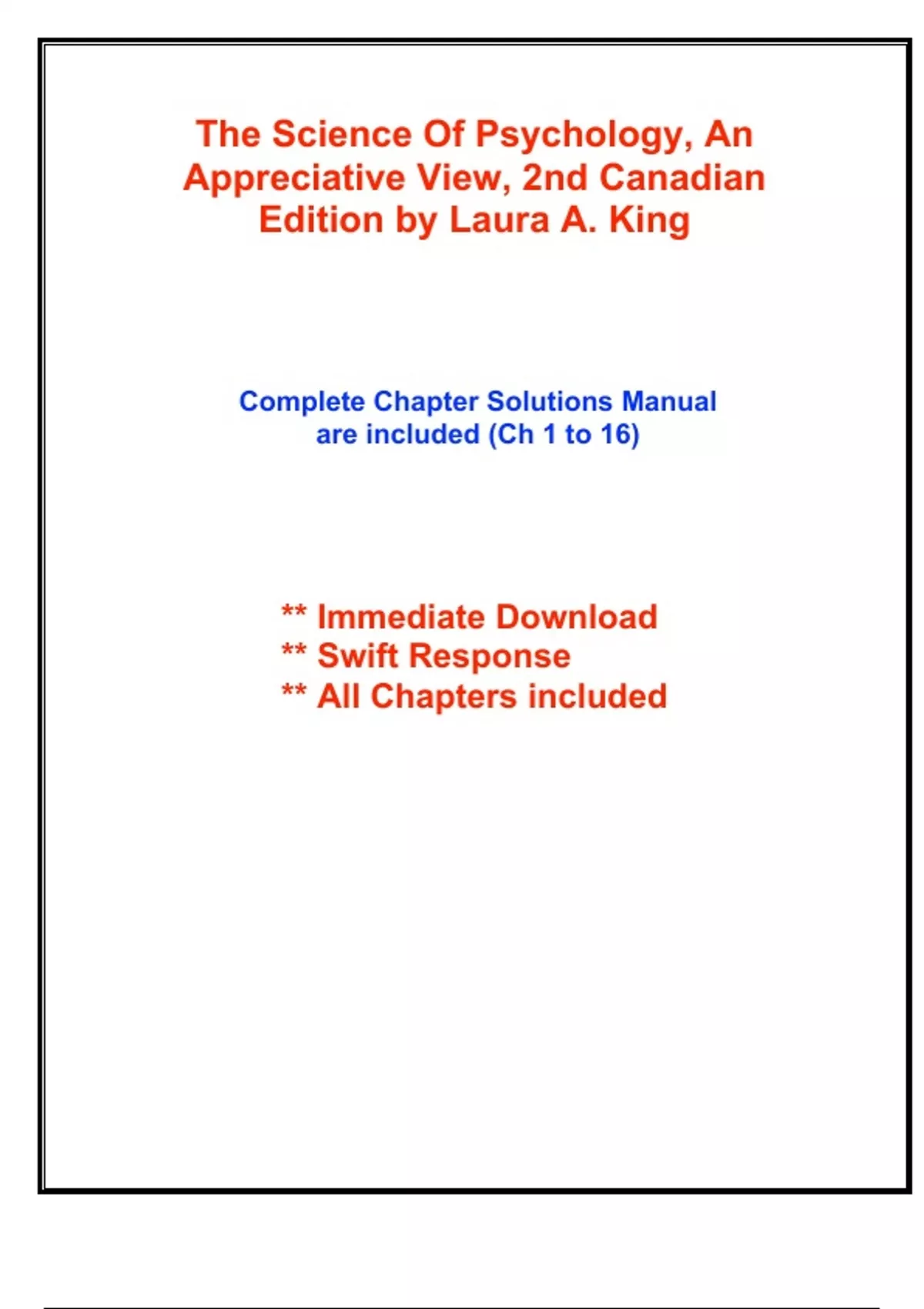 Complete Solutions Manual for The Science Of Psychology, An Appreciative View, 2nd Canadian Edition by Laura A. King, Dax Urbszat ; ISBN13: 9781264832125....(Full Chapters are included and organized in reverse order from Chapter 16 to 1)...CHAPTER 1 What Is Psychology? CHAPTER 2 What Is the Scientific Method in Psychology? CHAPTER 3 What Are the Biological Foundations of Behaviour? CHAPTER 4 What Are Sensation and Perception? CHAPTER 5 What Is Consciousness? CHAPTER 6 What Is Learning? CHAPTER 7 What Is Memory? CHAPTER 8 What Are Thinking, Intelligence, and Language? CHAPTER 9 How Do Humans Develop? CHAPTER 10 What Are Motivation and Emotion? CHAPTER 11 What Are Gender, Sexuality, and Sexual Behaviour? CHAPTER 12 What Is Personality? CHAPTER 13 What Is Social Psychology? CHAPTER 14 What Are Psychological Disorders? CHAPTER 15 What Is Therapy? CHAPTER 16 What Is Health Psychology?
