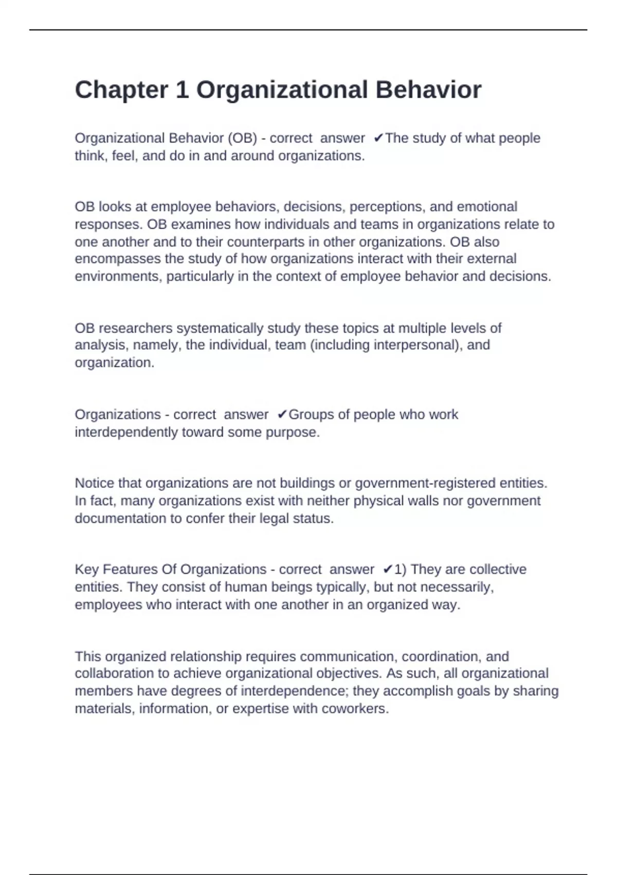Organizational Behavior (OB) - correct answer ✔The study of what people