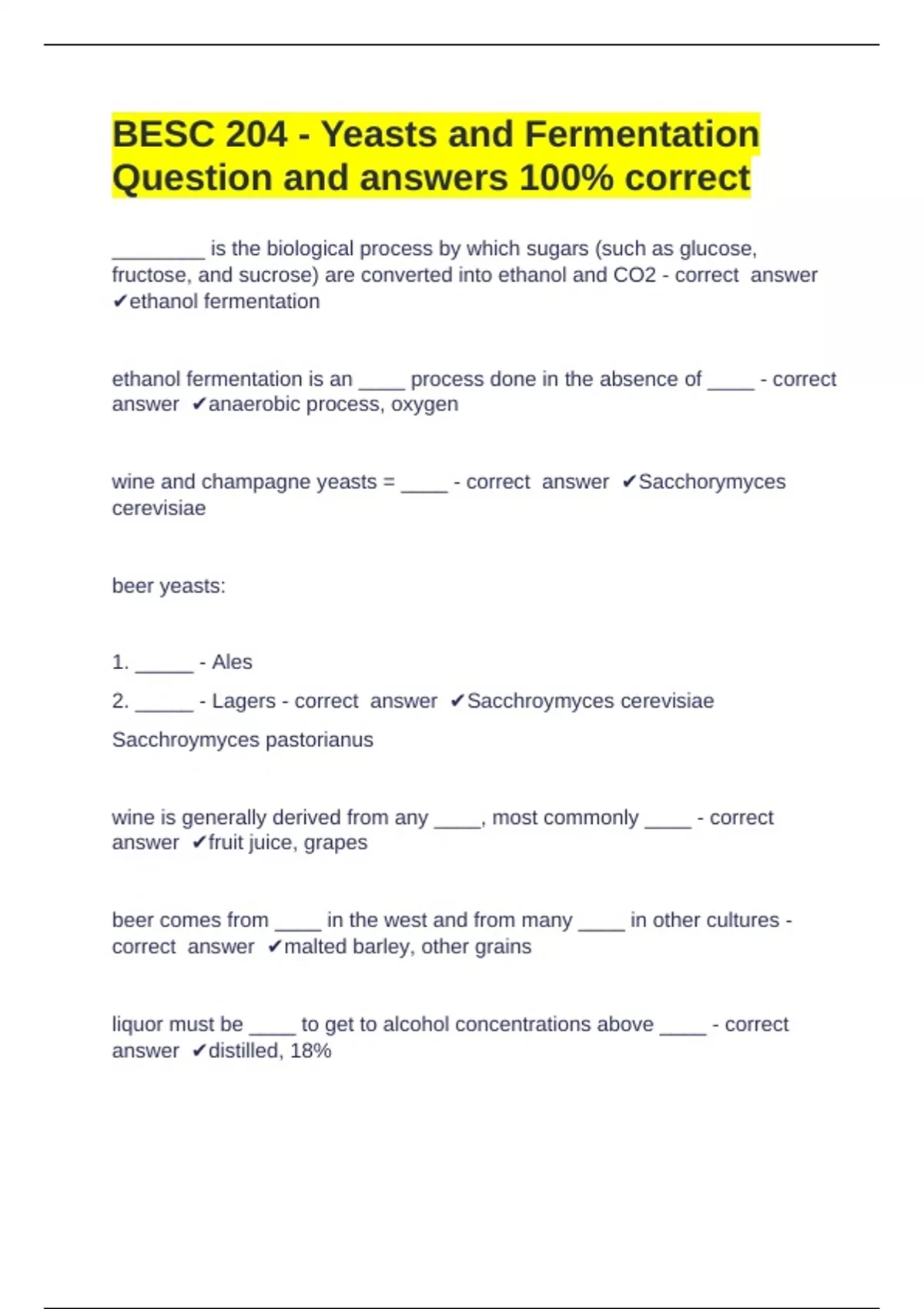 BESC 204 - Yeasts and Fermentation Question and answers 100% correct ________ is the biological process by which sugars (such as glucose, fructose, and sucrose) are converted into ethanol and CO2 - correct answer ethanol fermentation ethanol fermentation is an ____ process done in the absence of ____ - correct answer anaerobic process, oxygen wine and champagne yeasts = ____ - correct answer Sacchorymyces cerevisiae beer yeasts: 1. _____ - Ales 2. _____ - Lagers - correct answer Sacchroymyces cerevisiae Sacchroymyces pasto
