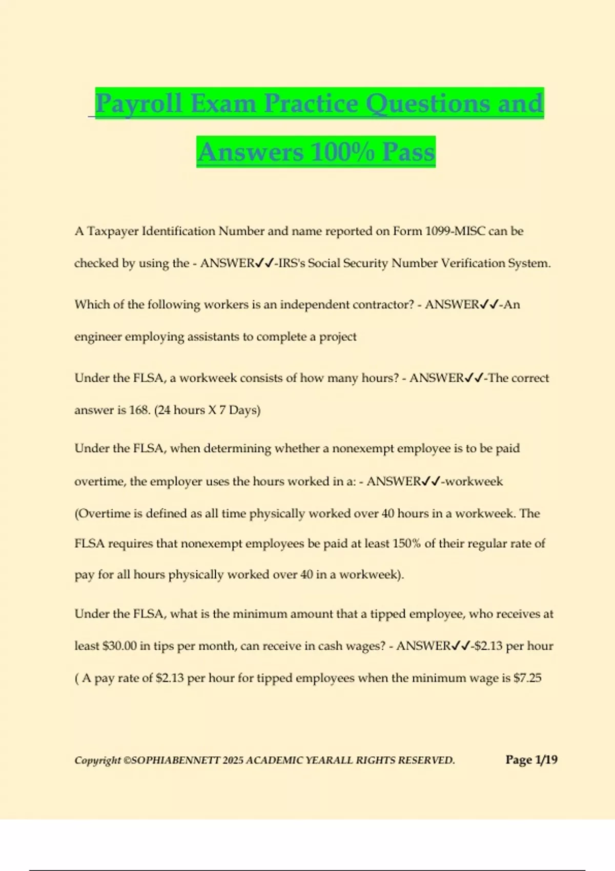 Payroll Exam Practice Questions and Answers 100% Pass A Taxpayer Identification Number and name reported on Form 1099-MISC can be checked by using the - ANSWER-IRS's Social Security Number Verification System. Which of the following workers is an independent contractor? - ANSWER-An engineer employing assistants to complete a project Under the FLSA, a workweek consists of how many hours? - ANSWER-The correct answer is 168. (24 hours X 7 Days) Under the FLSA, when determining whether a nonexempt employee is to be paid overtime, the employer uses the hours worked in a: - ANSWER-workweek (Overtime is defined as all time physically worked over 40 hours in a workweek. The FLSA requires that nonexempt employees be paid at least 150% of their regular rate of pay for all hours physically worked over 40 in a workweek). Under the FLSA, what is the minimum amount that a tipped employee, who receives at least $30.00 in tips per month, can receive in cash wages? - ANSWER-$2.13 per hour ( A pay rate of $2.13 per hour for tipped employees when the minimum wage is $7.25 Copyright ©SOPHIABENNETT 2025 ACADEMIC YEARALL RIGHTS RESERVED. Page 2/19 per hour means that employers can take a tip credit of up to $5.12 per hour, when the tips received by the employee are at least $5.12 per hour) A 15-year-old employee works part-time. Under the FLSA, during the summer months, what hours can the employee work? - ANSWER-Only until 9:00 p.m. (They also can work only between 7 a.m. and 7 p.m. (expanded to between 7 a.m. and 9 p.m. from June 1 through Labor Day). A tipped employee is paid $3.50 per hour. During the first week of 2015, the employee works 40 hours and receives $125.00 in tips. Under the FLSA, the tipped employee's total compensation must be a minimum of: - ANSWER-7.25 ( 125/40)+3.50= 6.63-less than minimum wage Employers must remind employees to complete an amended Form W-4 if they have any changes in status: - ANSWER-by December 1 of each year. An employee who is a full-time student is claimed as a dependent by her parents. What conditions must exist for the employee to claim exempt status on Form W-4? - ANSWER-Total income is less than $1,050.00 including unearned income of less than $350.00 An employee's spouse died on July 1. When must the employee file a new Form W-4 with the employer? - ANSWER-Before the first pay period of the next year (The death of a spouse does not require the surviving spouse to file a new Form W-4 until January 1 of the year after the spouse's death) Copyright ©SOPHIABENNETT 2025 ACADEMIC YEARALL RIGHTS RESERVED. Page 3/19 For a tipped employee to be paid $2.13 per hour, what is the minimum amount of tips the employee must receive each month? - ANSWER-$30.00 (Under the FLSA, employers may pay tipped employees (who receive at least $30 in tips during a month) $2.13 per hour as long as the amount of the employee's tips is enough to raise the employee's regular rate of pay to the minimum wage for the workweek. If the tips are not enough to raise the regular rate of pay to ($7.25 per hour) for the workweek, the employer must pay the difference, ensuring the employee the minimum wage for the week) Under the FLSA, calculate the overtime premium pay for a nonexempt employee who is paid $10.00 per hour and works 45 hours in the workweek. - ANSWER-$25 (they would make $15 an hour- so a $5 difference X 5 hours= $25) Under the FLSA, calculate a nonexempt employee's compensation for a workweek when the employee is paid $4.50 for each item produced, produces 100 items, and works 45 hours. - ANSWER-(4.50 x 45)/100= $10 per hour. 10 X 150%= $15 OT rate ($10 X 40) + (15 X 5 OT) = $475.00 A nonexempt employee earns $15.00 per hour. Last week, the employee earned a production bonus of $51.00 according to the union contract. The employee worked 48 hours last week. Calculate the employee's gross pay for the week. - ANSWER- $15*48=$720+$51= $771 Copyright ©SOPHIABENNETT 2025 ACADEMIC YEARALL RIGHTS RESERVED. Page 4/19 771/48=16.06/2=8.03 8.03*8(OT)=64.25 64.25+771=835.25 How does imputed income impact an employee's net pay? - ANSWER-It decreases the net pay by the additional taxes. (Imputed income represents the value of the benefits employees receive from the employer and must be included in the employees' income. In most cases, employees do not receive cash as the benefit. Employers are required to impute income to employees for each taxable noncash benefit received by the employee. Imputing income reduces employees' net pay by increasing taxes. The employee does not receive additional pay in the form of cash. An example of imputed income is taxable group-term life insurance) When using the Optional Flat Rate Method, by what percentage is a bonus divided when grossing up for employees with YTD wages less than $118,50