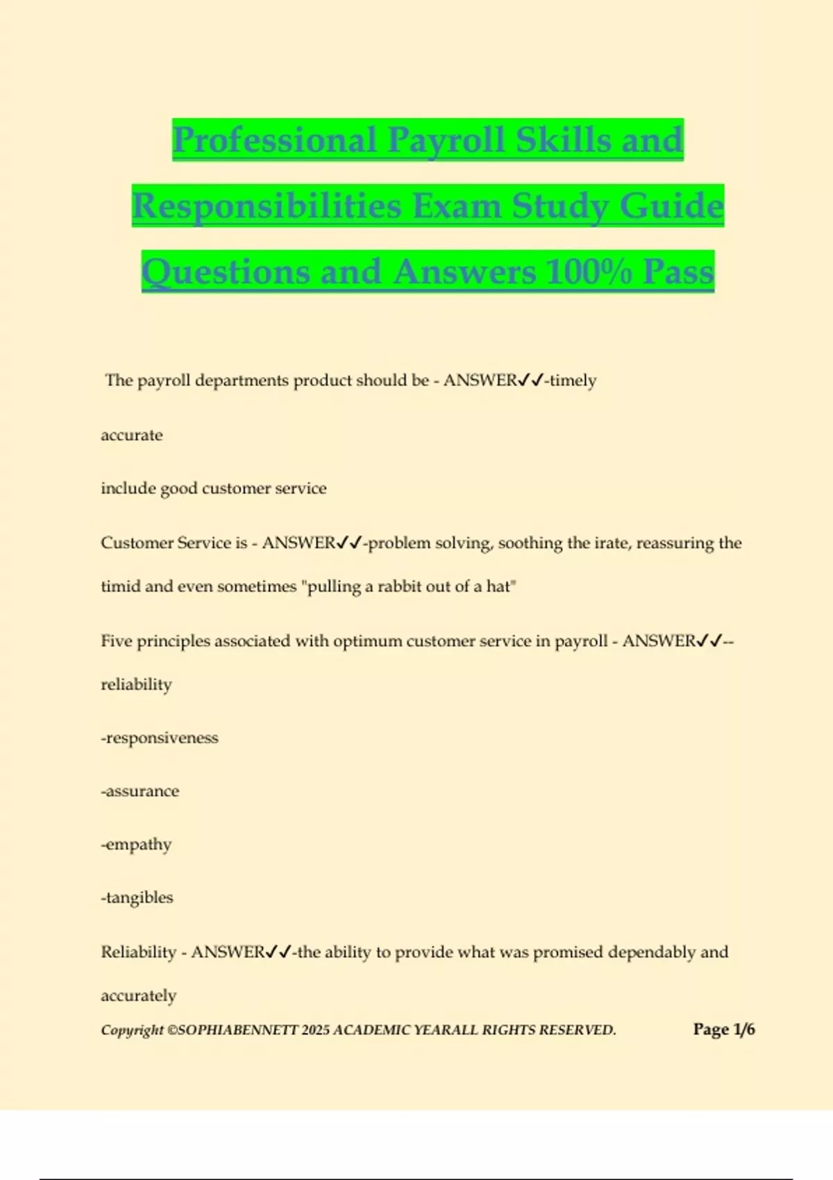 Copyright ©SOPHIABENNETT 2025 ACADEMIC YEARALL RIGHTS RESERVED. Page 1/6 Professional Payroll Skills and Responsibilities Exam Study Guide Questions and Answers 100% Pass The payroll departments product should be - ANSWER-timely accurate include good customer service Customer Service is - ANSWER-problem solving, soothing the irate, reassuring the timid and even sometimes "pulling a rabbit out of a hat" Five principles associated with optimum customer service in payroll - ANSWER-- reliability -responsiveness -assurance -empathy -tangibles Reliability - ANSWER-the ability to provide what was promised dependably and accurately Copyright ©SOPHIABENNETT 2025 ACADEMIC YEARALL RIGHTS RESERVED. Page 2/6 When a commitment to a process is made it should be - ANSWER-realistic and attainable Responsiveness - ANSWER-the willingness to help customers promptly Assurance - ANSWER-knowledge and courtsey you show to your customers and your ability to convey trust, competence and confidence Empathy - ANSWER-the degree of caring and individual attention shown to your customers Tangibles - ANSWER-the physical facilities and equipment and your own, as well as others, appearance Compliance - ANSWER-acting in accordance with a direct request from another person or group; requires coordination of regulations Confidentiality - ANSWER-the act of holding information in confidence, not to be released to unauthorized individuals Employees' privacy rights are governed by - ANSWER-federal and state law and company policy Whistleblower Policy - ANSWER-are critical tools for protecting individuals who report activities believed to be illegal, dishonest, unethical, or otherwise improper; policy is committed to protecting employees who has made a protected disclosure without retaliation from the employer Copyright ©SOPHIABENNETT 2025 ACADEMIC YEARALL RIGHTS RESERVED. Page 3/6 To ensure compliance in payroll processing, payroll professionals must be - ANSWER-aware of legislative and regulatory changes; analyzing theses changes and how they impact payroll processing will ensure continued compliance IRS provides additional guidance: - ANSWER--Revenue Procedures -Revenue Rulings -Private Letter Rulings Revenue Procedures - ANSWER-are procedural directions on the implementation of sections of the IRC Revenue Rulings - ANSWER-are directions on how