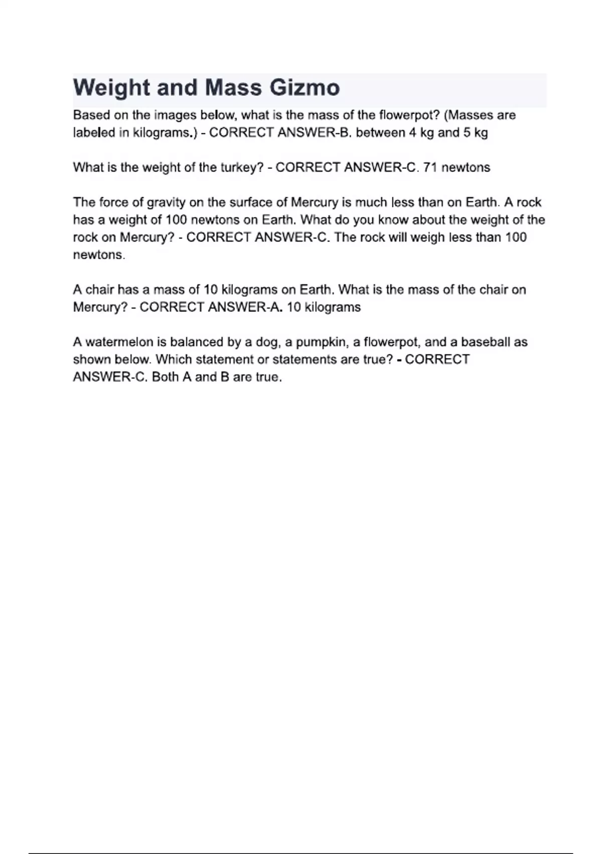 Weight and Mass Gizmo questions and answers