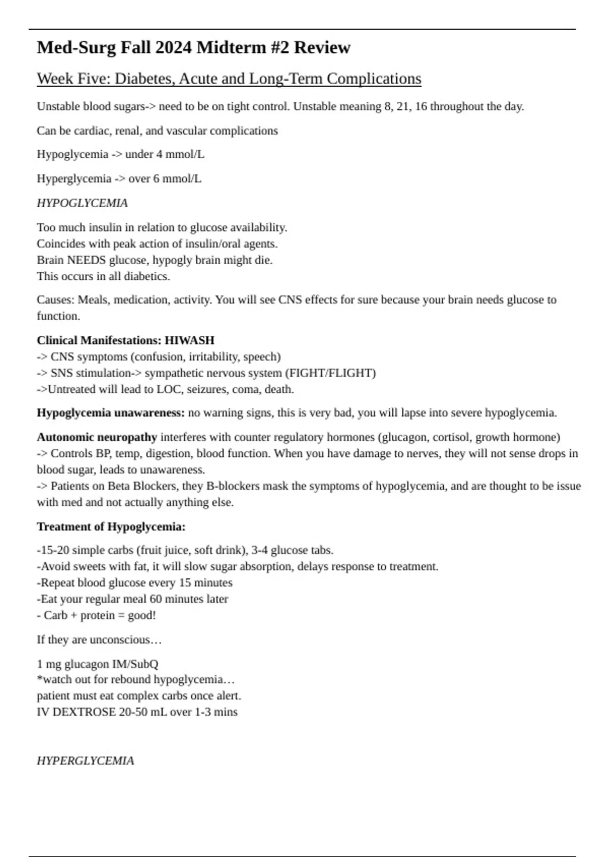 Everything you need to know about content weeks 5-8 in Adult Health and Health Alterations. Including complications of diabetes (DKA, HHNS, hypo and hyperglycemia, musculoskeletal, acid-base imbalances).