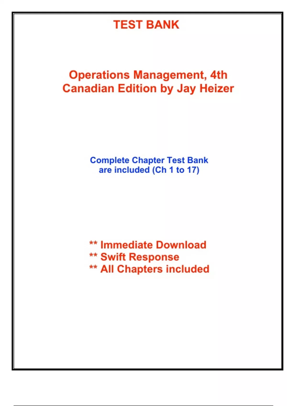 Complete Test Bank for Operations Management, 4th Canadian Edition by Jay Heizer, Barry Render, Paul Griffin ; ISBN13: 9780137319152...(Full Chapters included and organized in reverse order from Chapter 17 to 1)...1.Operations and Productivity 2.Operations Strategy in a Global Environment 3.Project Management 4.Forecasting 5.Design of Goods and Services 6.Managing Quality 7.Process Strategy 8.Location Strategies 9.Layout Strategies 10.Human Resources, Job Design, and Work Measurement 11.Supply Chain Management 12.Inventory Management 13.Aggregate Planning and Sales and Operations Planning 14.Material Requirements Planning (MRP) and ERP 15.Short-Term Scheduling 16.Lean Operations 17.Maintenance and Reliability