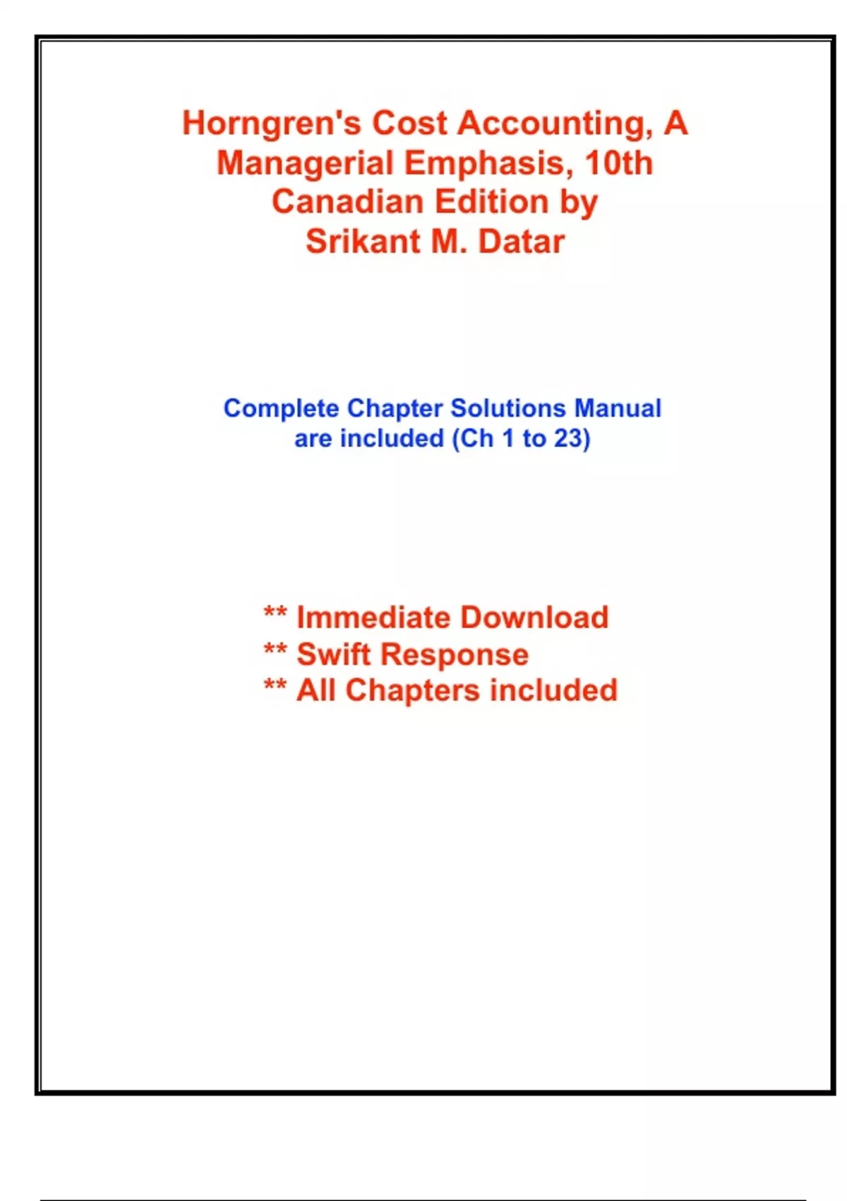Complete Solutions Manual for Horngren's Cost Accounting, A Managerial Emphasis, 10th Canadian Edition by Srikant M. Datar, Madhav V. Rajan, Louis Beaubien ; ISBN13: 9780137915927...(Full Chapters included and organized in reverse order from Chapter 23 to 1)...1.The Accountant's Vital Role in Decision Making 2.An Introduction to Cost Terms and Purposes 3.Cost–Volume–Profit Analysis 4.Job Costing 5.Activity-Based Costing and Management 6.Master Budget and Responsibility Accounting 7.Flexible Budgets, Variances, and Management Control: I 8.Flexible Budgets, Variances, and Management Control: II 9.Income Effects of Denominator Level on Inventory Valuation 10.Analysis of Cost Behaviour 11.Decision Making and Relevant Information 12.Data Analytic Thinking and Prediction 13.Pricing Decisions: Profitability and Cost Management 14.Strategy, the Balanced Scorecard, and Profitability Analysis 15.Period Cost Application 16.Cost Allocation: Joint Products and Byproducts 17.Revenue and Customer Profitability Analysis 18.Process Costing 19.Spoilage, Rework, and Scrap 20.Inventory Cost Management Strategies 21.Capital Budgeting: Methods of Investment Analysis 22.Transfer Pricing and Multinational Management Control Systems 23.Multinational Performance Measurement and Compensation
