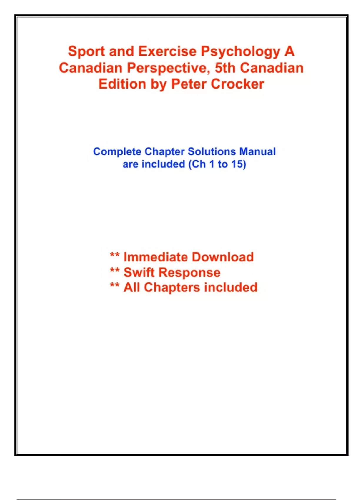 Complete Solutions Manual for Sport and Exercise Psychology A Canadian Perspective, 5th Canadian Edition by Peter Crocker ; ISBN13: 9780137930968...(Full Chapters included and organized in reverse order from Chapter 15 to 1)...1.Introducing Sport and Exercise Psychology 2.Personality in Sport and Exercise 3.Motivation and Behavioural Change 4.Stress, Emotion, and Coping in Sport and Exercise 5.Anxiety in Sport and Exercise 6.Aggression and Moral Behaviour in Sport 7.Sport Psychology Interventions 8.Leadership in Sport and Exercise 9.Group Cohesion in Sport and Exercise 10.Youth Involvement and Positive Development in Sport 11.Coaching Psychology 12.Aging and Involvement in Sport and Physical Activity 13.Physical Activity and Mental Health 14.Body Image in Sport and Exercise 15.Physical Activity Interventions