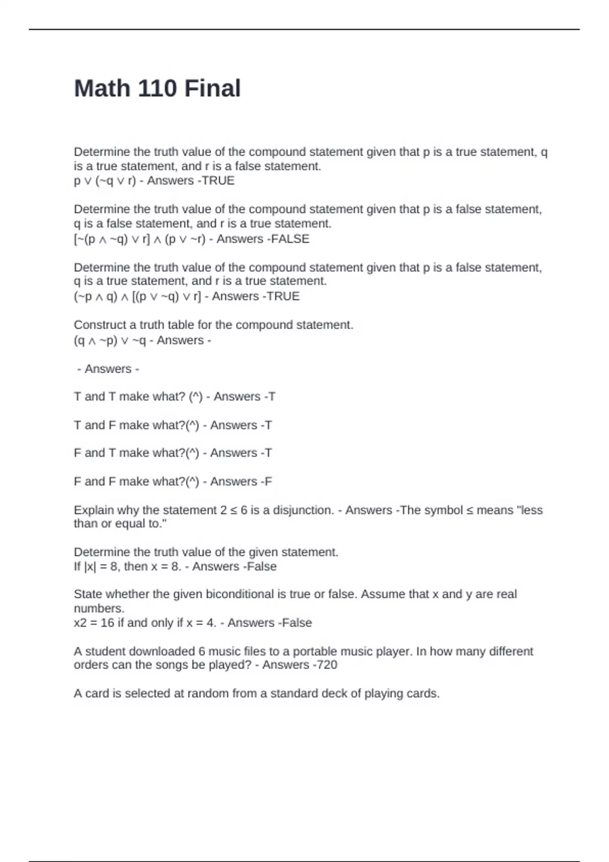 Math 110 Final Exam Questions with 100% Answers