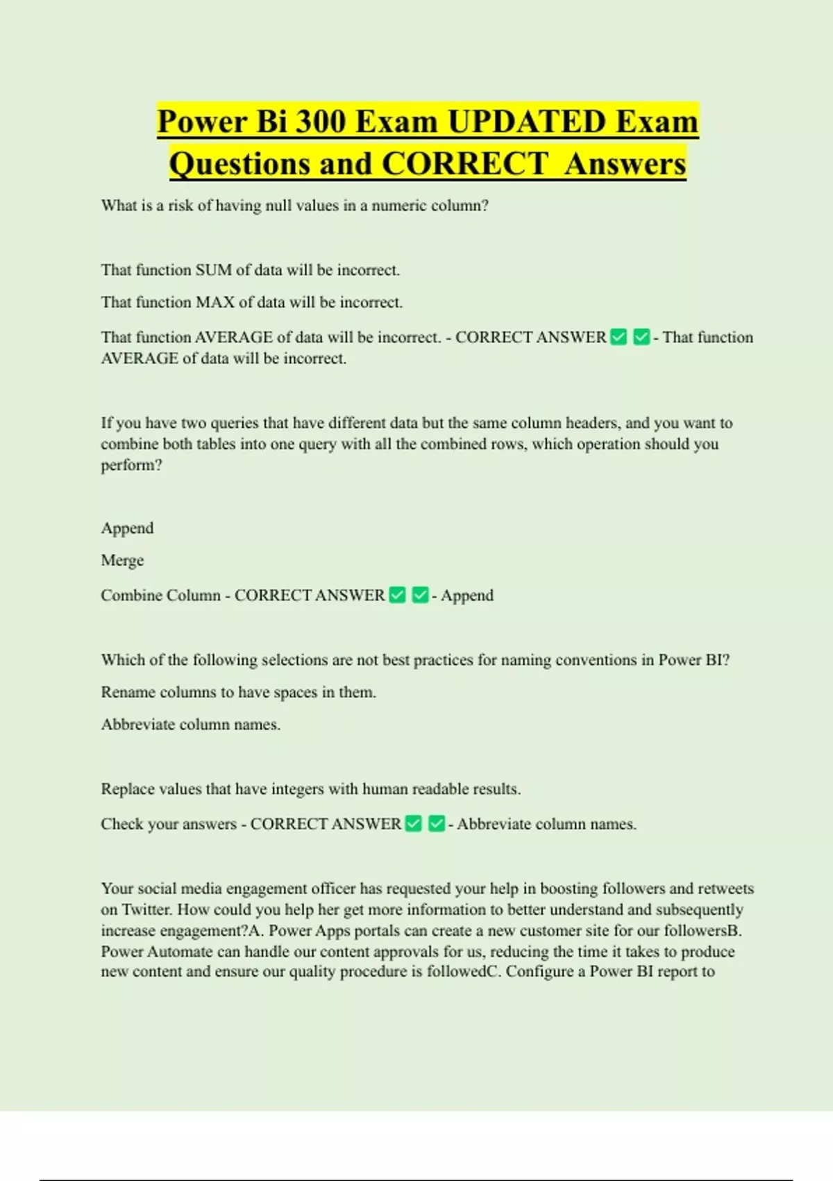 Power Bi 300 Exam UPDATED Exam Questions and CORRECT Answers What is a risk of having null values in a numeric column? That function SUM of data will be incorrect. That function MAX of data will be incorrect. That function AVERAGE of data will be incorrect. - CORRECT ANSWER - That function AVERAGE of data will be incorrect
