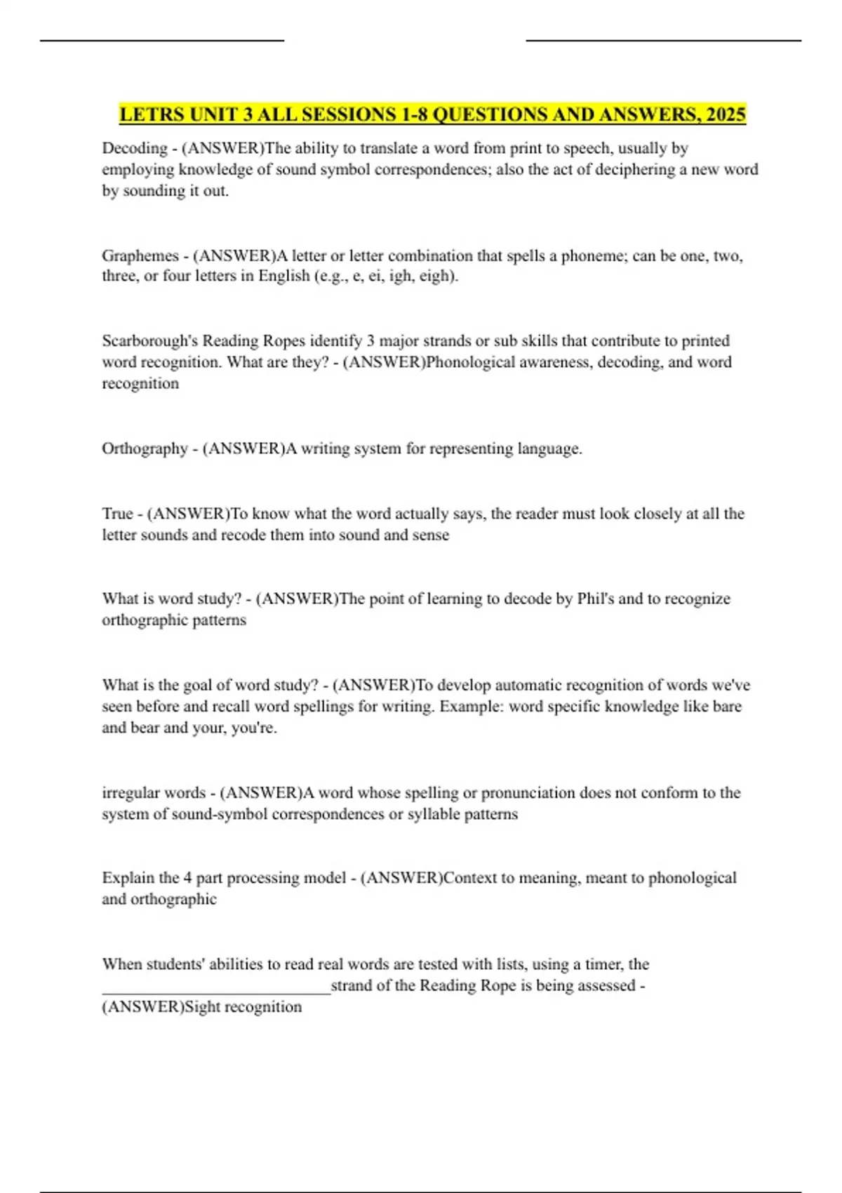 LETRS UNIT 3 ALL SESSIONS 1-8 QUESTIONS AND ANSWERS, 2025