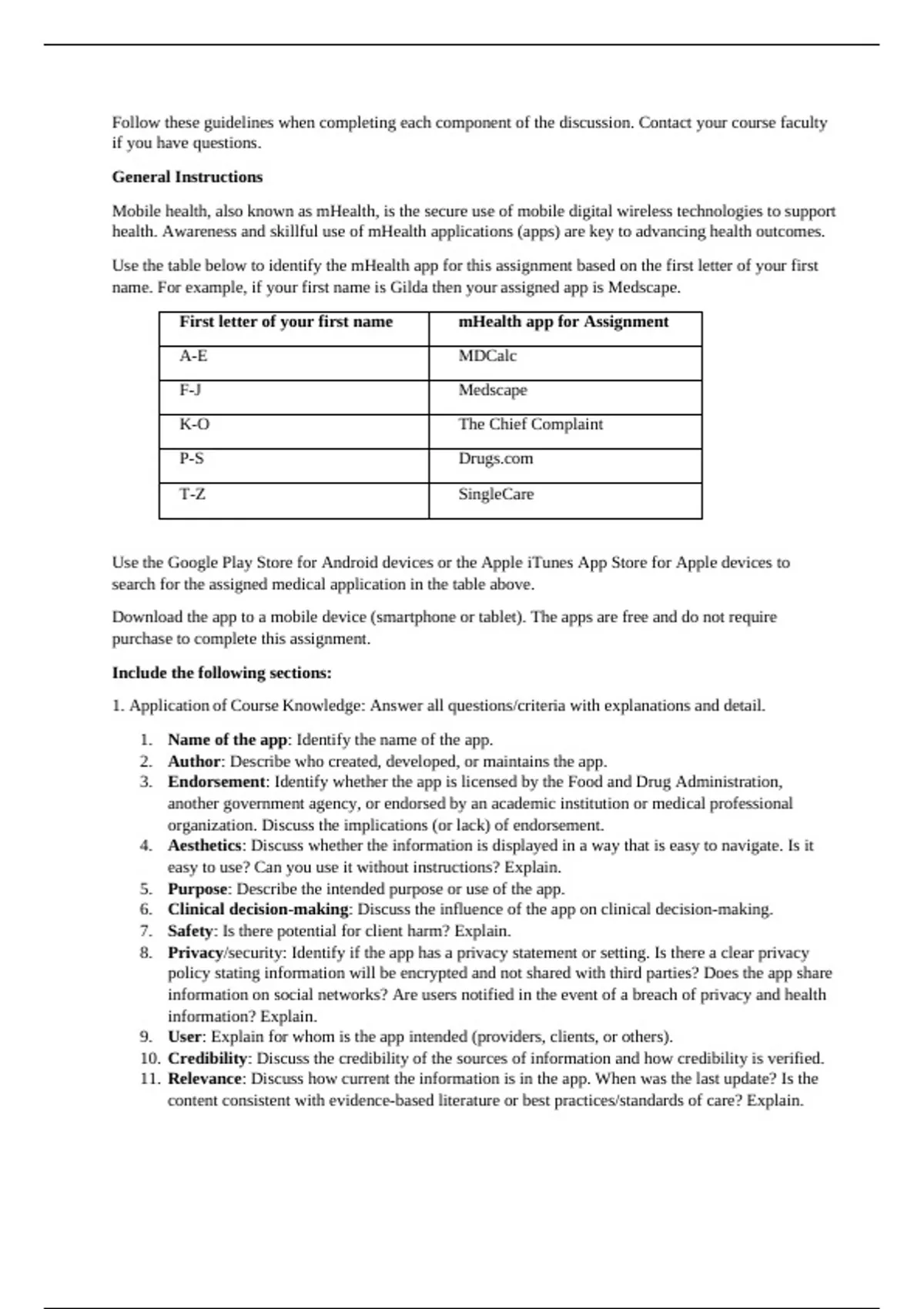 Use the table below to identify the mHealth app for this assignment based on the first letter of your first