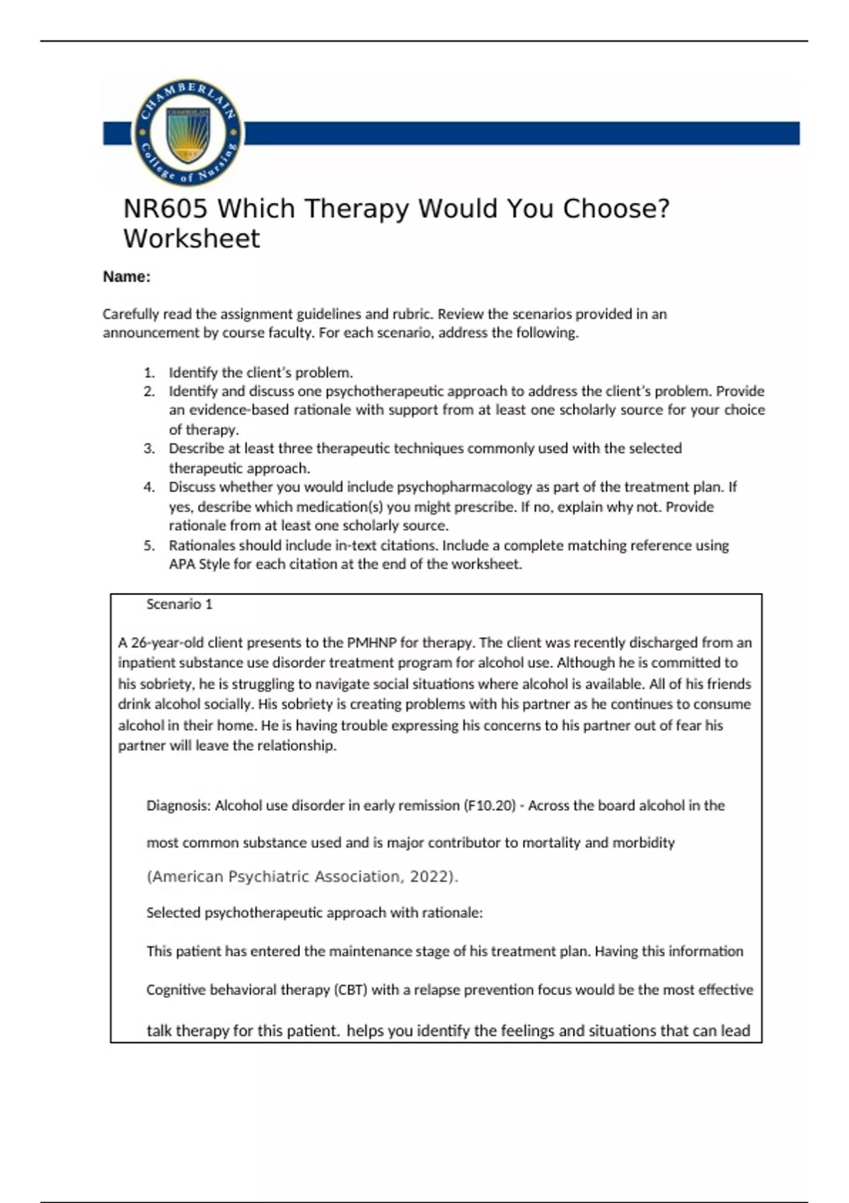 NR 605 Week 5 Assignment; Which Therapy Would You Choose. Worksheet - 3 Different Scenarios