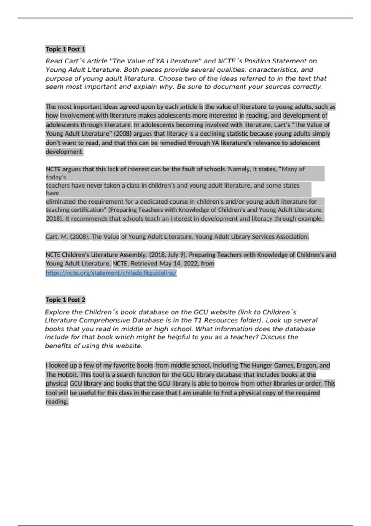 Read Cart´s article "The Value of YA Literature" and NCTE´s Position Statement on