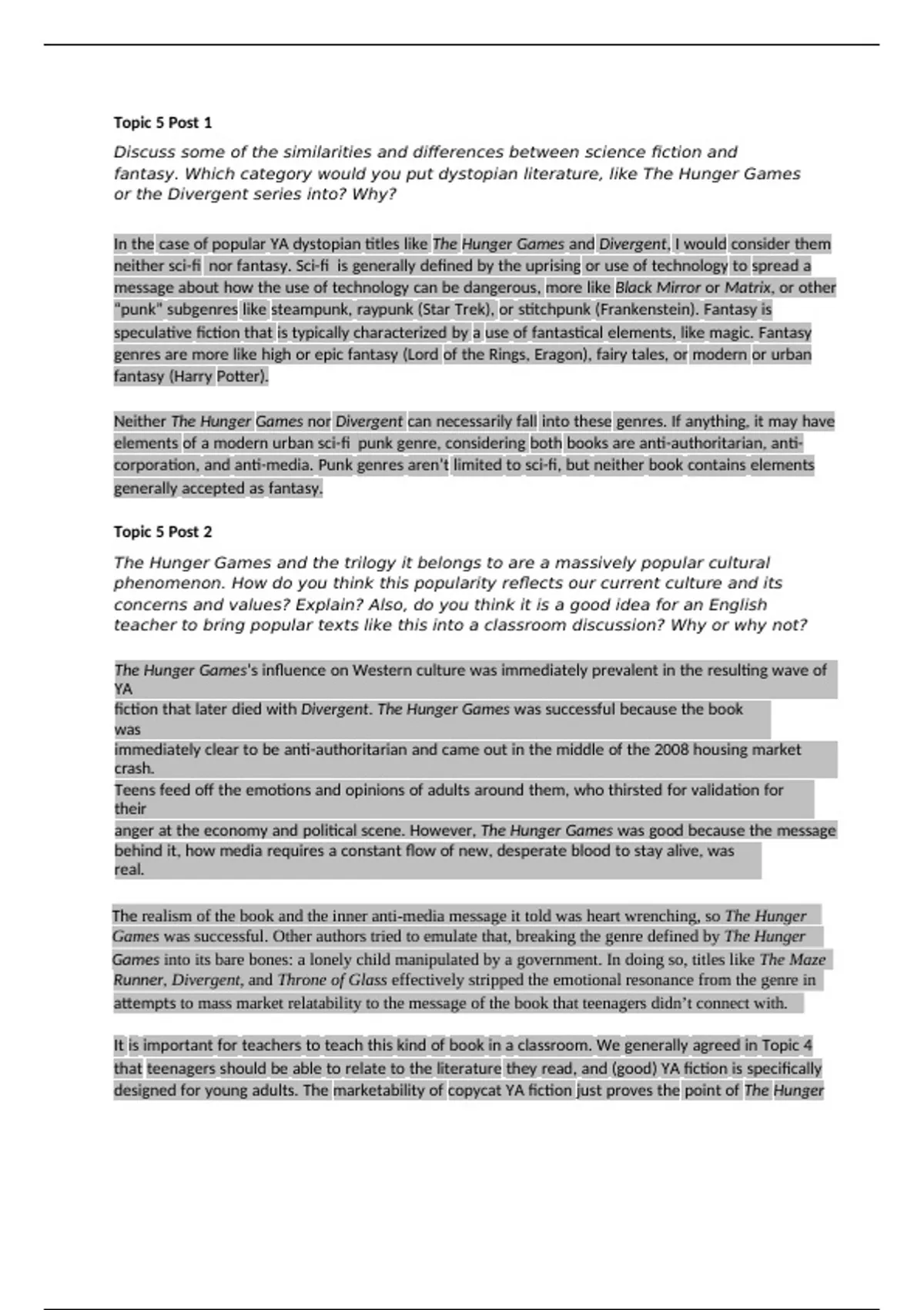 fantasy. Which category would you put dystopian literature, like The Hunger Games