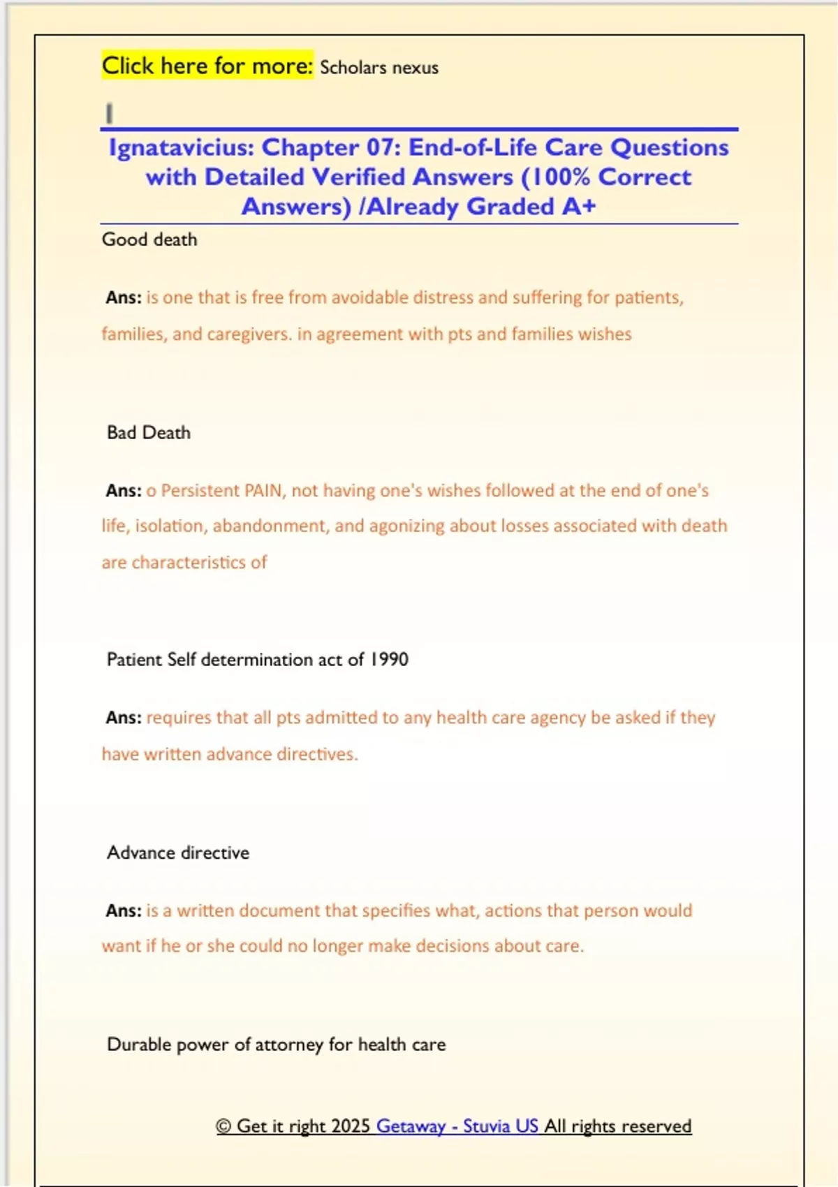 Ignatavicius: Chapter 07: End-of-Life Care Questions with Detailed Verified Answers (100% Correct Answers) /Already Graded A+