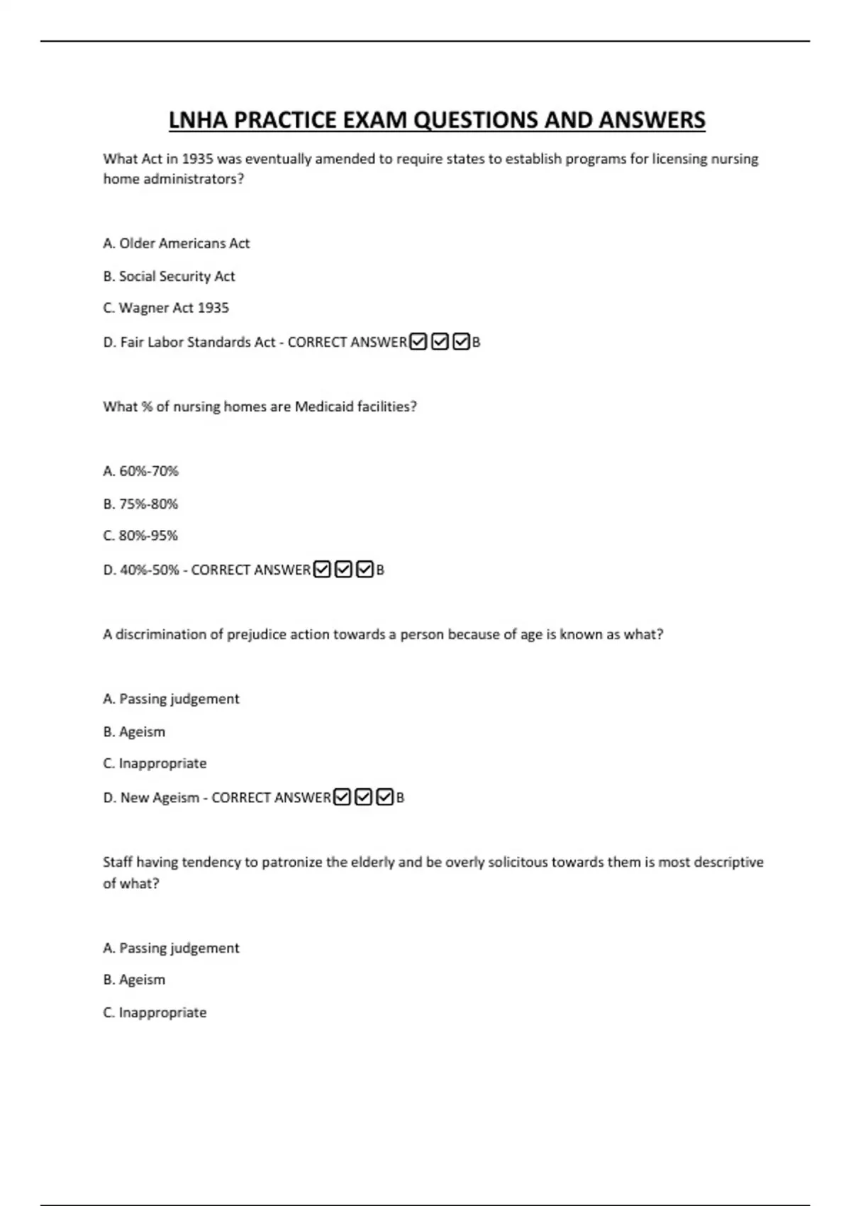 LNHA PRACTICE EXAM QUESTIONS AND ANSWERS What Act in 1935 was eventually amended to require states to establish programs for licensing nursing home administrators? A. Older Americans Act B. Social Security Act C. Wagner Act 1935 D. Fair Labor Standards Act - CORRECT ANSWERB