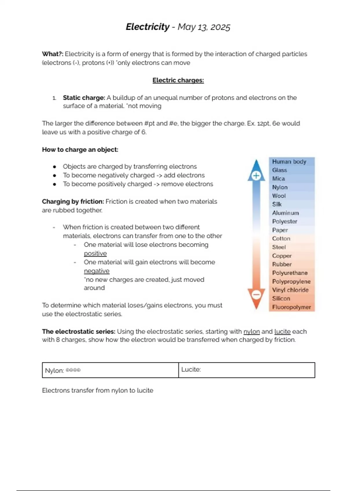 The electrostatic series: Using the electrostatic series, starting with nylon and lucite each