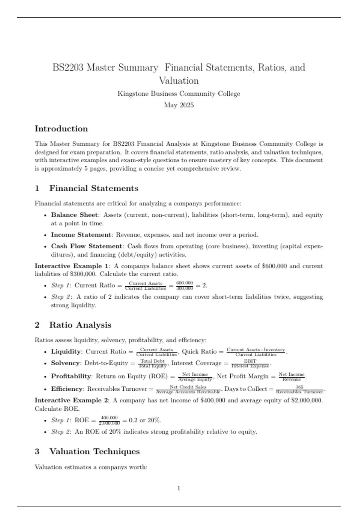 This Master Summary for BS2203 Financial Analysis at Kingstone Business Community College is