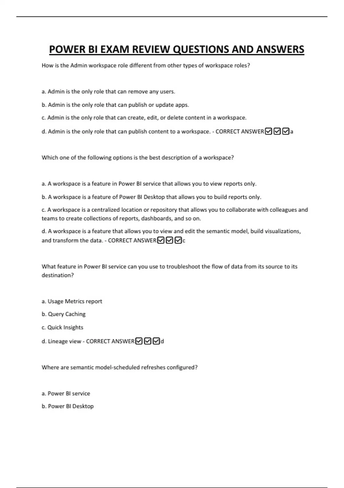 POWER BI EXAM REVIEW QUESTIONS AND ANSWERS How is the Admin workspace role different from other types of workspace roles? a. Admin is the only role that can remove any users. b. Admin is the only role that can publish or update apps. c. Admin is the only role that can create, edit, or delete content in a workspace. d. Admin is the only role that can publish content to a workspace. - CORRECT ANSWERa