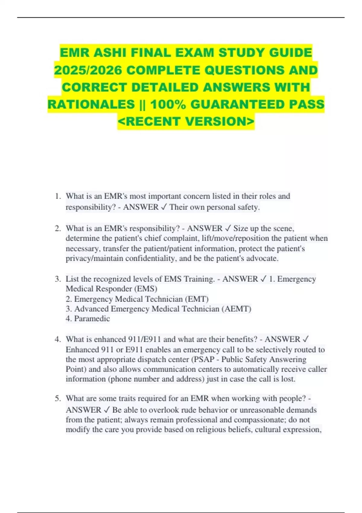 EMR ASHI FINAL EXAM STUDY GUIDE 2025/2026 COMPLETE QUESTIONS AND CORRECT DETAILED ANSWERS WITH RATIONALES || 100% GUARANTEED PASS &lt;RECENT VERSION&gt; 1. What is an EMR's most important concern listed in their roles and responsibility? - ANSWER Their own personal safety. 2. What is an EMR's responsibility? - ANSWER Size up the scene, determine the patient's chief complaint, lift/move/reposition the patient when necessary, transfer the patient/patient information, protect the patient's privacy/maintain confidentiality, and be the patient's advocate. 3. List the recognized levels of EMS Training. - ANSWER 1. Emergency Medical Responder (EMS) 2. Emergency Medical Technician (EMT) 3. Advanced Emergency Medical Technician (AEMT) 4. Paramedic 4. What is enhanced 911/E911 and what are their benefits? - ANSWER Enhanced 911 or E911 enables an emergency call to be selectively routed to the most appropriate dispatch center (PSAP - Public Safety Answering Point) and also allows communication centers to automatically receive caller information (phone number and address) just in case the call is lost. 5. What are some traits required for an EMR when working with people? - ANSWER Be able to overlook rude behavior or unreasonable demands from the patient; always remain professional and compassionate; do not modify the care you provide based on religious beliefs, cultural expression, age, sex, social behavior, socioeconomic background, or geographic origin; be honest, realistic and able to control your feelings. 6. What is On-line medical direction? - ANSWER Orders to perform a skill or administer care from the on-duty physician, given to the rescuer by radio/phone. 7. What is Off-line medical direction? - ANSWER An EMS system's written standing orders and protocols, which authorize personnel to perform particular skills in certain situations without actually speaking to the medical director or her designating agent. 8. What are Standing orders? - ANSWER The medical director's specific insert ions for specific medical conditions or injuries. 9. What is a Scope of practice? - ANSWER The care that an Emergency Medical Responder, an Emergency Medical Technician or Paramedic is allowed and supposed to provide according to local, state, or regional regulations or statutes. 10. What are Protocols? - ANSWER Written guidelines that direct the care EMS personnel provide for patients. 11. What is Negligence? - ANSWER A failure to provide the expected standard of care. 12. What are four elements that must prove negligence to be successful? - ANSWER 1. Duty to act 2. Breach of duty 3. Damages 4. Causation 13. Who are the acceptable people an EMR is able to provide patient information to? - ANSWER Other health care providers who are part of the continued care of the patient. 14. What are the two types of consent? - ANSWER Expressed consent (a competent adult's decision to accept emergency care) and Informed consent ( consent granted by a patient after he has been appropriately informed of the care being suggested and associated consequences. 15. What are two types of alert and oriented patients who can not give consent or refuse care? - ANSWER Children and Emancipated Minors 16. What is assault? - ANSWER Restraining or threatening to restrain a patient against his or her wishes could result in a violation of criminal law and result in a charge of assault and/or battery. 17. If an EMR touches someone against there will? - ANSWER battery 18. If an EMR is paid a member, they are required to respond because of a - ANSWER duty to act 19. When could you share confidential information? - ANSWER When giving a report to arriving medical professionals. 20. You respond to a scene where to possible victims tell you they are okay and don't need your help, you should - ANSWER Carefully document the refusal of care 21. You ask a patient if it is okay to help them and they state yes. What type of consent is used? - ANSWER Expressed 22. An organism capable of causing infection is known as - ANSWER pathogen 23. Route of exposure through the skin is - ANSWER Absorption 24. Primary duty at a HAZMAT scene - ANSWER Use PPE 25. Showing up at work feeling unenthusiastic, low self esteem, and hopelessness is? - ANSWER Burnout 26. Immunization recommended for EMR's is - ANSWER Varicella 27. Upper right side pain is - ANSWER RUQ 28. Injury to bone is - ANSWER Musculoskeletal System 29. Regulates blood sugar in the body - ANSWER Endocrine system 30. Lying on back face up - ANSWER supine 31. Response to sympathetic stimulation - ANSWER Hear rate increase 32. Anaerobic metabolism is caused by - ANSWER Too little oxygen 33. VF leads to - ANSWER electrical failure in heart 34. When lifting use - ANSWER good body mechanics 35. Before restraining someone have - ANSWER clear plan of action 36. Direct ground lift should require - ANSWER 3 people 37. Best method to move a patient from stretcher to hospital bed is - ANSWER draw sheet method 38. Which of these types of communication involves body language? - ANSWER Nonverbal 39. Active listening includes - ANSWER Asking clarifying questions 40. When speaking on a radio, it is important to - ANSWER speak clearly 41. A run report is - ANSWER a legal document 42. You should correct an error on paper by - ANSWER Draw a single line through the error and initial it. 43. A partial airway obstruction will present with - ANSWER Noisy breathing 44. Open the airway of non-trauma victim with - ANSWER head-tilt chin lift 45. Opening airway of trauma victim - ANSWER jaw-thrust 46. Brachial - ANSWER Pulse checked less than one year of age 47. Airway - ANSWER Primary concern in an unconscious patient 48. Left Side - ANSWER Position a pregnant woman is transported in due to Supine Hypotension 49. Supine Hypotension - ANSWER Pregnant patient laying on her back and the fetus is lying on the vena cava causing low BP, and heart rate 50. Crowning - ANSWER Appearance of the baby's head 51. Breech - ANSWER Presenting part is t