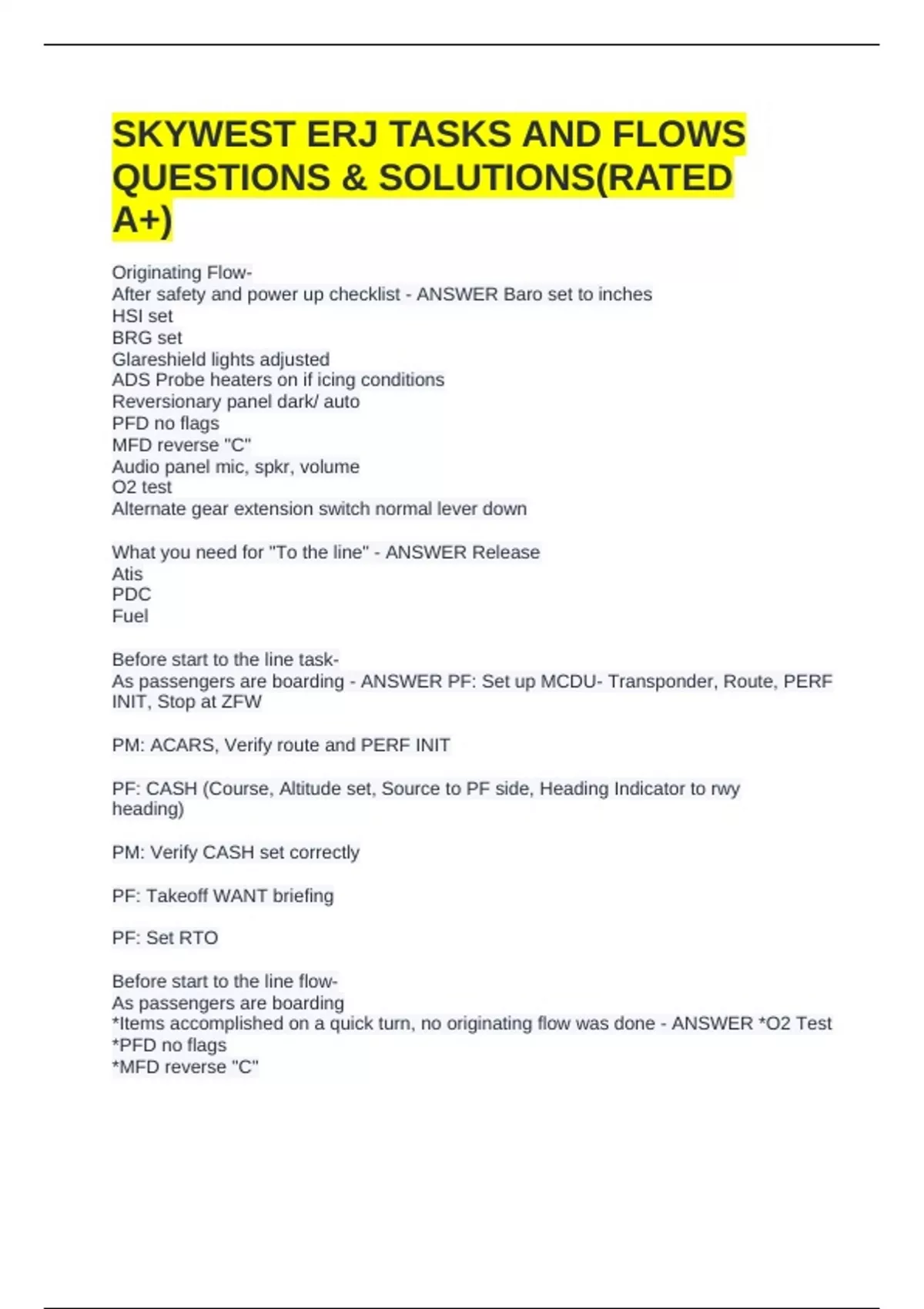 SKYWEST ERJ TASKS AND FLOWS QUESTIONS & SOLUTIONS(RATED A+)