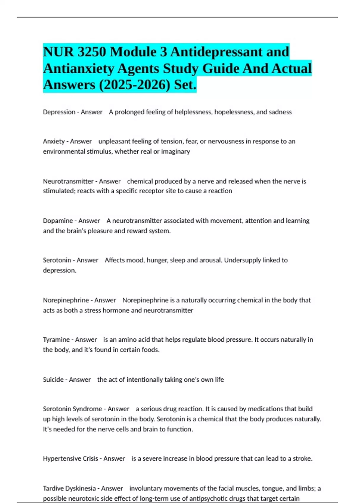 Depression - Answer A prolonged feeling of helplessness, hopelessness, and sadness Anxiety - Answer unpleasant feeling of tension, fear, or nervousness in response to an environmental stimulus, whether real or imaginary Neurotransmitter - Answer chemical produced by a nerve and released when the nerve is stimulated; reacts with a specific receptor site to cause a reaction Dopamine - Answer A neurotransmitter associated with movement, attention and learning and the brain's pleasure and reward system. Serotonin - Answer Affects mood, hunger, sleep and arousal. Undersupply linked to depression. Norepinephrine - Answer Norepinephrine is a naturally occurring chemical in the body that acts as both a stress hormone and neurotransmitter Tyramine - Answer is an amino acid that helps regulate blood pressure. It occurs naturally in the body, and it's found in certain foods. Suicide - Answer the act of intentionally taking one's own life Serotonin Syndrome - Answer a serious drug reaction. It is caused by medications that build up high levels of serotonin in the body. Serotonin is a chemical that the body produces naturally. It's needed for the nerve cells and brain to function. Hypertensive Crisis - Answer is a severe increase in blood pressure that can lead to a stroke. Tardive Dyskinesia - Answer involuntary movements of the facial muscles, tongue, and limbs; a possible neurotoxic side effect of long-term use of antipsychotic drugs that target certain dopamine receptors Benzodiazepines: Alprazolam - Answer Pharmacodynamics: reduces Anxiety