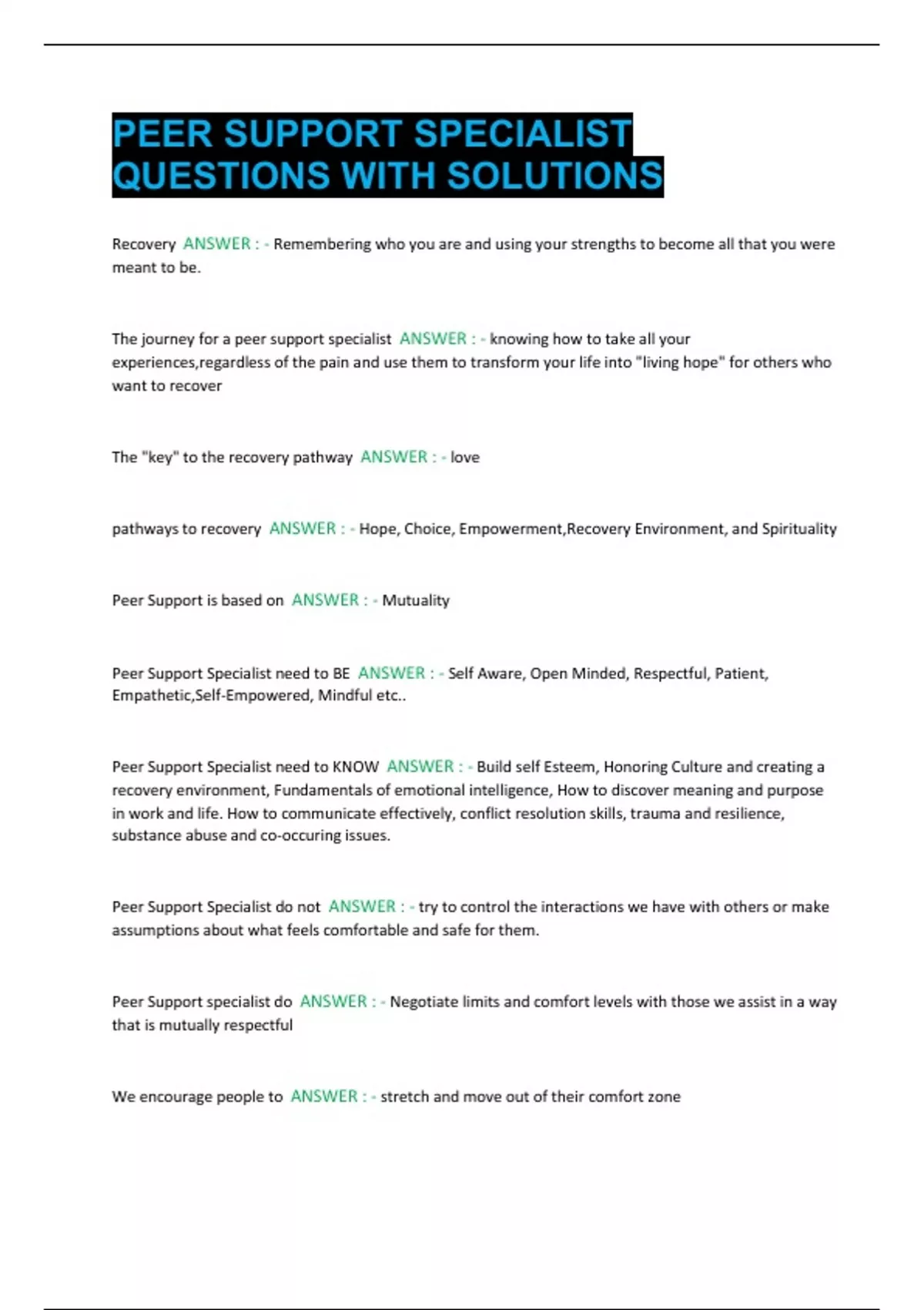 PEER SUPPORT SPECIALIST QUESTIONS WITH SOLUTIONS