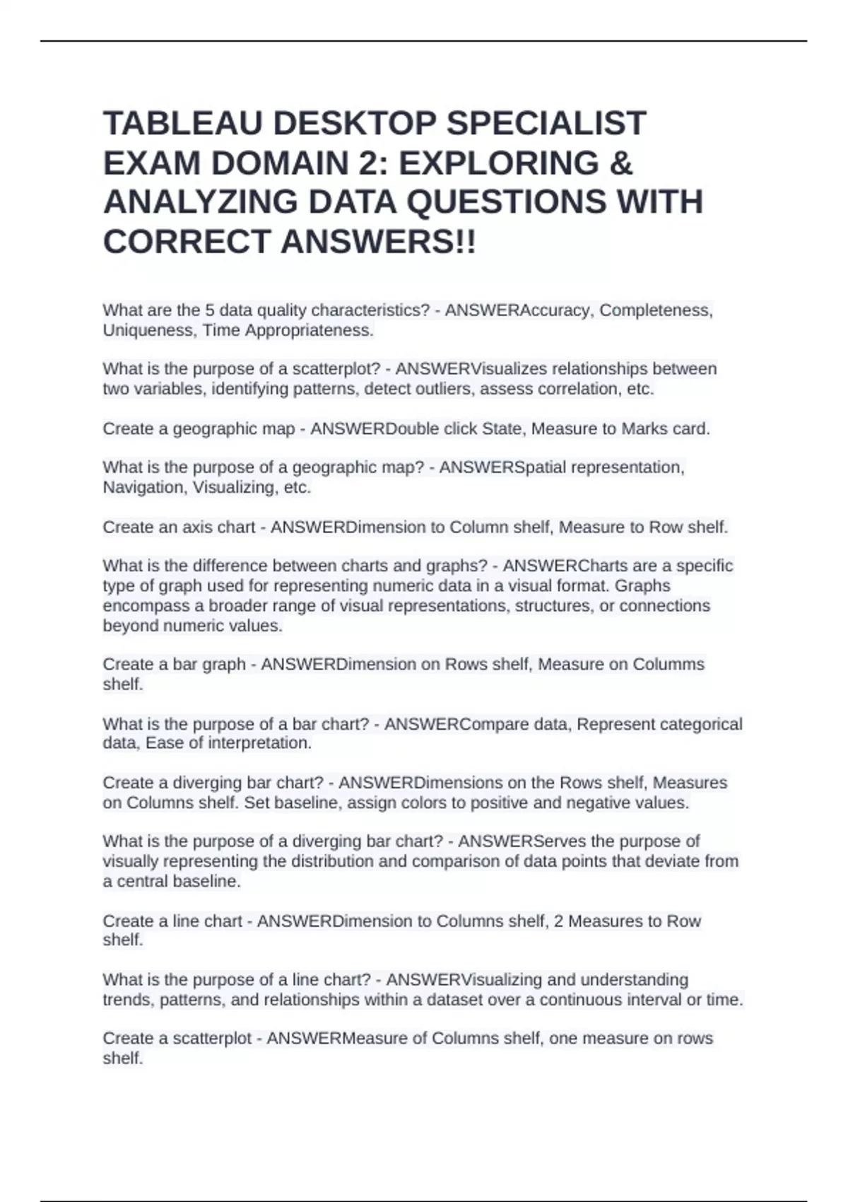 What are the 5 data quality characteristics? - ANSWERAccuracy, Completeness, Uniqueness, Time Appropriateness. What is the purpose of a scatterplot? - ANSWERVisualizes relationships between two variables, identifying patterns, detect outliers, assess correlation, etc. Create a geographic map - ANSWERDouble click State, Measure to Marks card. What is the purpose of a geographic map? - ANSWERSpatial representation, Navigation, Visualizing, etc. Create an axis chart - ANSWERDimension to Column shelf, Measure to Row shelf. What is the difference between charts and graphs? - ANSWERCharts are a specific type of graph used for representing numeric data in a visual format. Graphs encompass a broader range of visual representations, structures, or connections beyond numeric values.