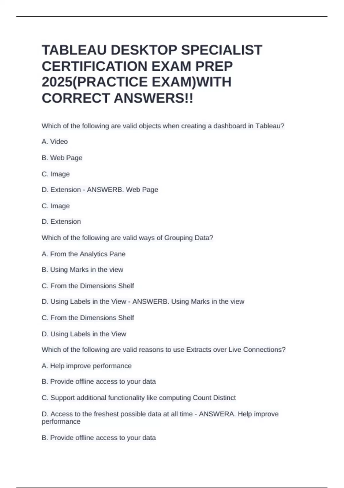 Which of the following are valid objects when creating a dashboard in Tableau? A. Video B. Web Page C. Image D. Extension - ANSWERB. Web Page C. Image D. Extension Which of the following are valid ways of Grouping Data? A. From the Analytics Pane B. Using Marks in the view C. From the Dimensions Shelf D. Using Labels in the View - ANSWERB. Using Marks in the view C. From the Dimensions Shelf D. Using Labels in the View Which of the following are valid reasons to use Extracts over Live Connections? A. Help improve performance B. Provide offline access to your data C. Support additional functionality like computing Count Distinct D. Access to the freshest possible data at all time - ANSWERA. Help improve performance B. Provide offline access to your data C. Support additional functionality like computing Count Distinct Which of the following is a benefit of using a Tableau Data Source (.tds)? A. To not contain the actual data but rather the information necessary to connect to the actual data as well as any modifications you've made on top of the actual data such as c